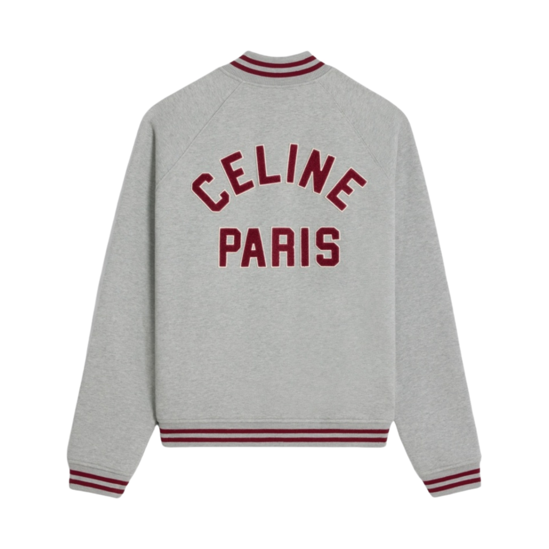 Celine Teddy College Jacket in Cotton Fleece Grey Melange Red Grape Off W
