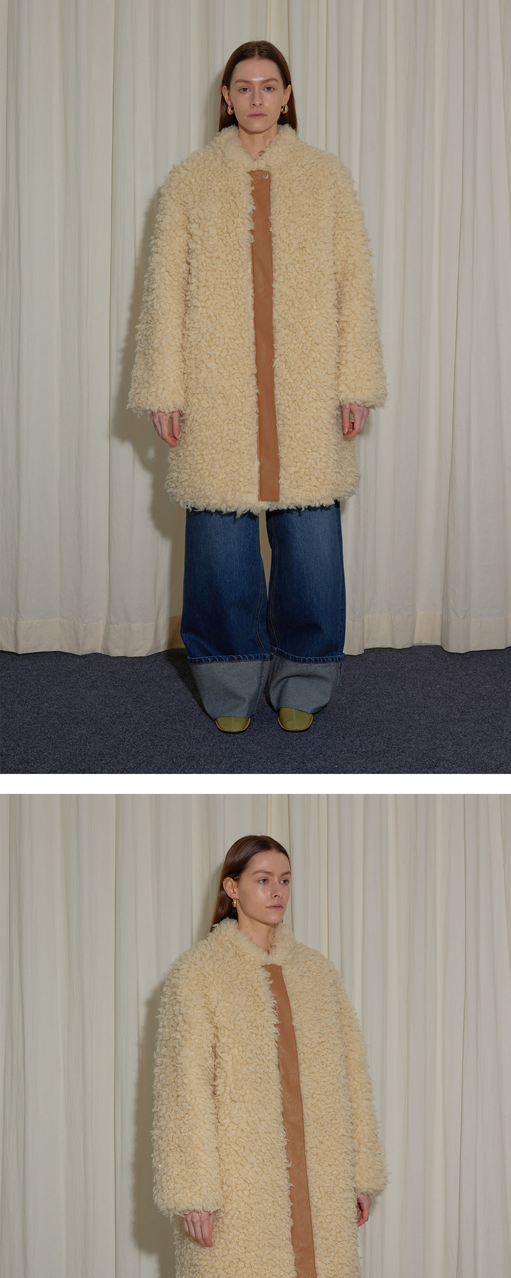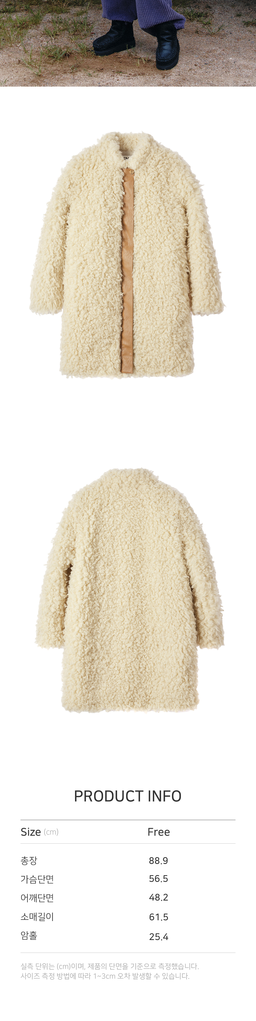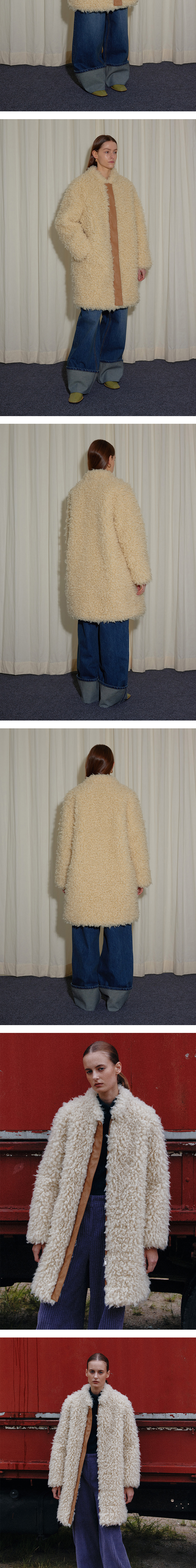 - 긴 기장감과 오버사이즈 핏의 클래식한 무드의 시어링코트입니다. - 헤어리하고 몽글거리는 FUR의 독특한 텍스처가 매력적이며, 기모 안감이 내장되어 있어 높은 보온성을 선사합니다. - 앞 중심의 클로징 부분에 레더 트리밍 디테일로 제품의 디자인 성을 높였습니다. -히든 금속 스냅과 지퍼 클로징으로 제품의 완성도를 높였습니다.