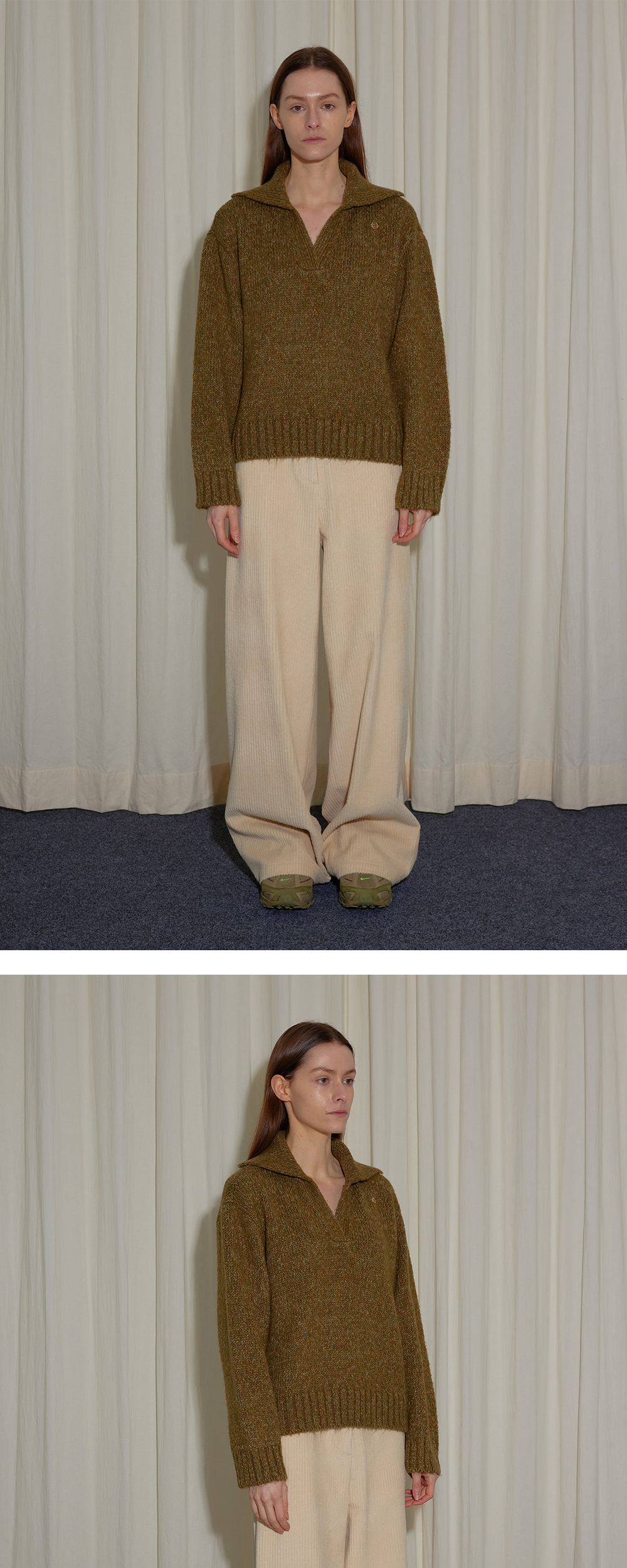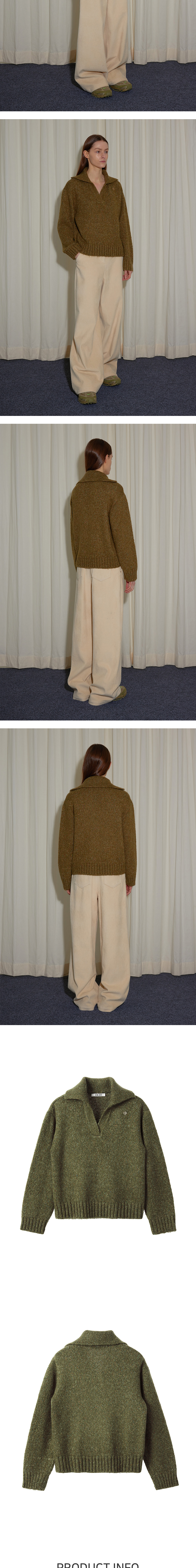 - 알파카와 캐시미어 혼방으로 가볍고 유연한 착용감이 돋보이는 풀오버 니트입니다. - 원사 이면에 얇게 한 겹을 짜낸 이중우수 조직으로 탄탄한 실루엣을 선사하며, 부드러운 촉감이 매력적입니다. - 전체적으로 툭 떨어지는 박시한 실루엣과 넓은 스탠드 카라로 캐주얼하게 완성했습니다.