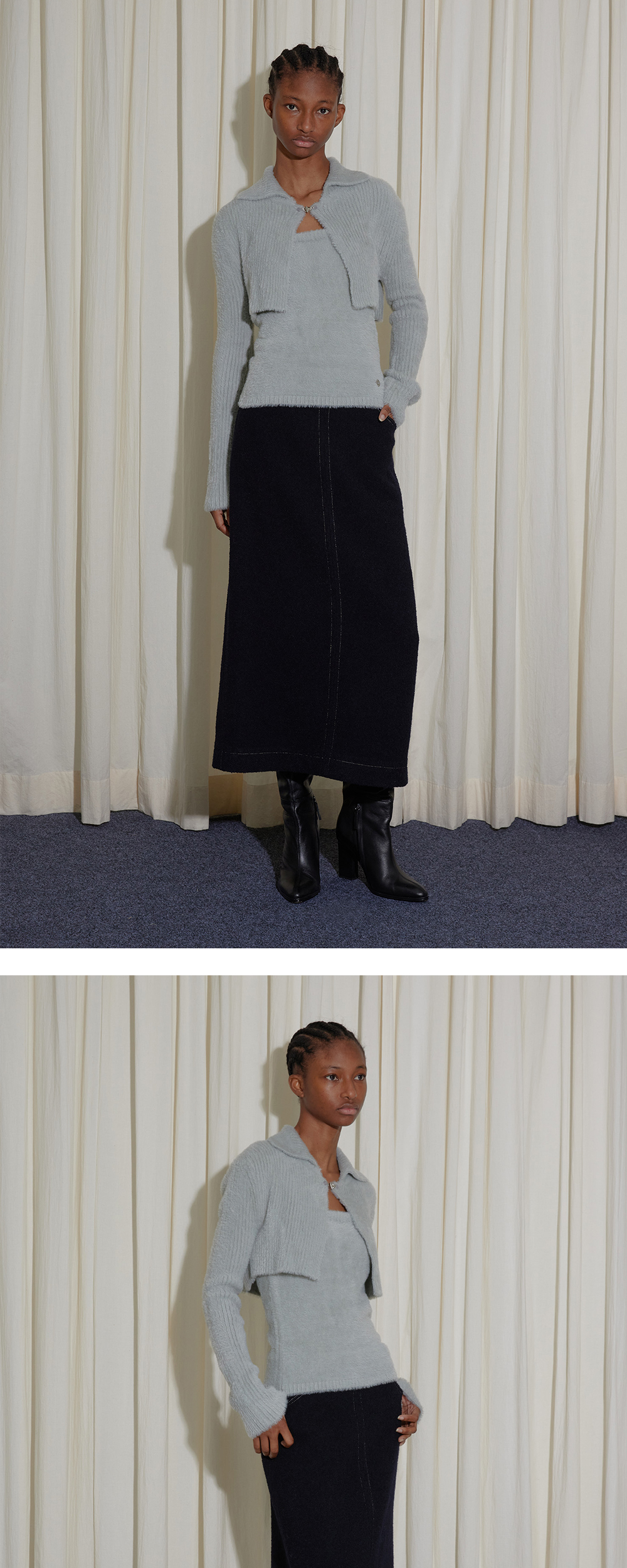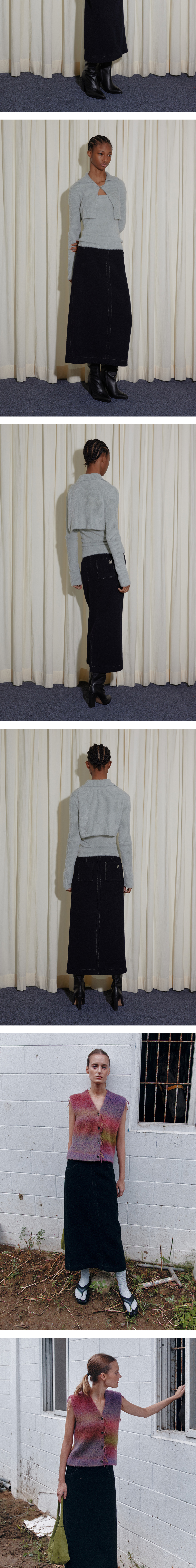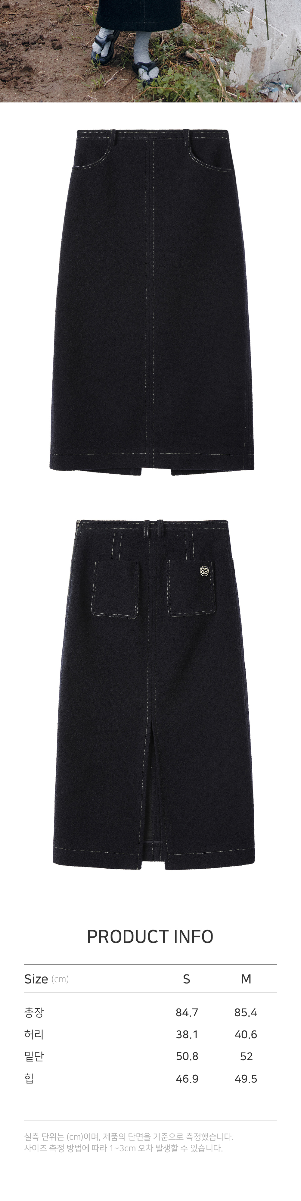 - 긴 기장감의 미니멀한 실루엣이 돋보이는 스커트입니다. - 소모 부클 원단을 사용하여 포근하고 따뜻한 무드를 연출하며, 배색 스티치 디테일로 포인트를 더했습니다. - 울 혼방 원단과 안감이 내장되어 따뜻하고 부드러운 착용감을 선사하며, 뒷면의 긴 슬릿으로 활동성을 높였습니다.