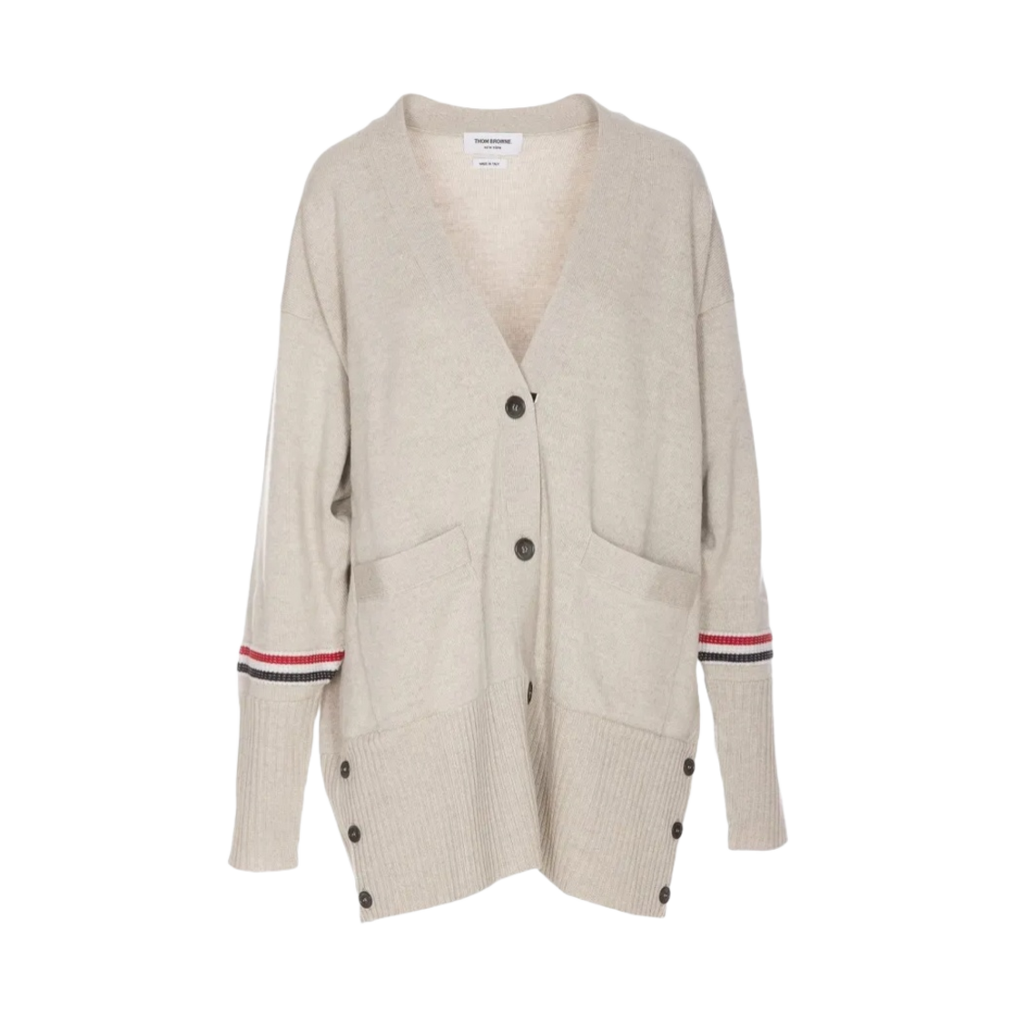 (W) Thom Browne Merino Wool Stripe Exaggerated V-Neck Cardigan Beige