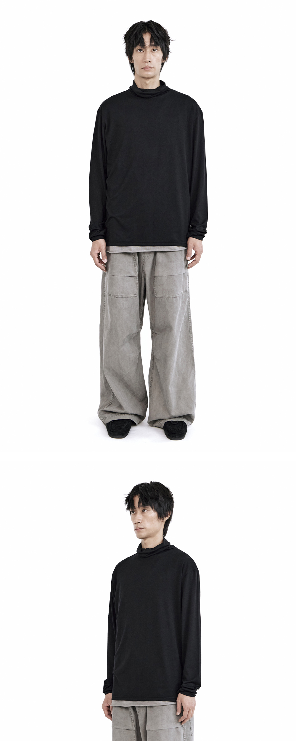 turtle neck sleeve - black, melange gray, charcoal 폴리테루에서 전개하는 거의 모든 상의 및 아우터와 좋은 조합을 이루는 이너 레이어. 특유의 드레이프를 유도하는 패턴과 부드러운 소재감으로 넥 주변 둘레가 자연스럽게 쌓이며, 매칭한 상의 및 아우터의 실루엣과 여유감을 패턴 그대로 최대한 구현할 수 있게끔 특유의 루즈한 밸런스를 유지하되 최소화한 볼륨이 특징입니다. 자연스러운 광택감과 부드러운 촉감을 가지고 있습니다. 셔츠, 스웻, 롱슬리브 등의 이너로 받쳐입기에 최적화된 제품으로, 단품 사용은 추천드리지 않습니다. 팬츠에 넣어입는 방식을 권장드리며, 이를 위한 넉넉한 기장감으로 제작되었습니다. *모델: 170 중반 / 마른 체형, 3사이즈 착용 *금번 차수는 기존 차수 대비 기장감 짧게 조정되었습니다.