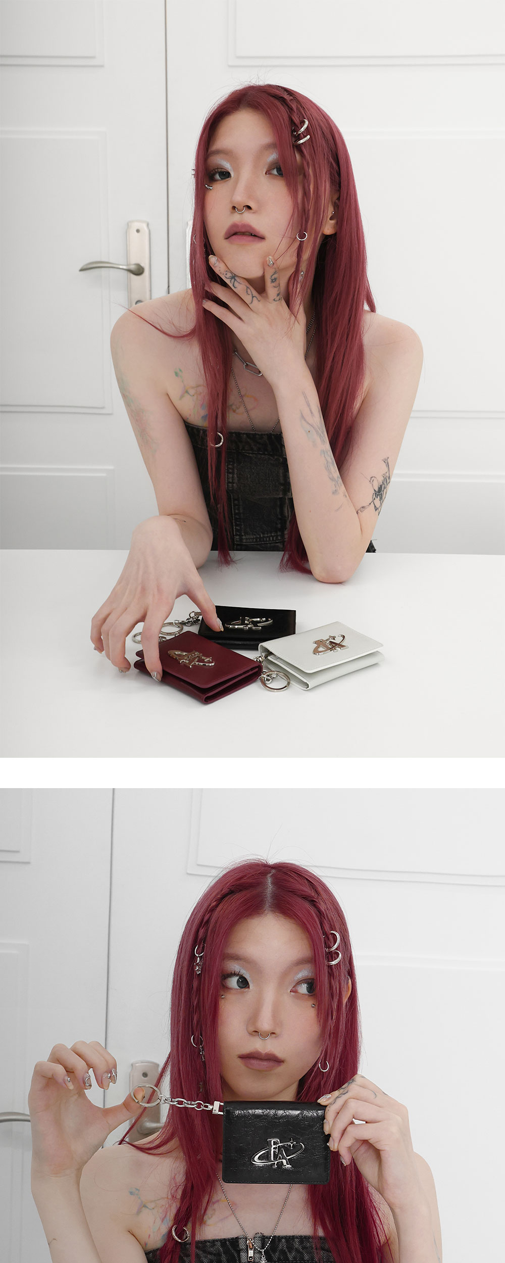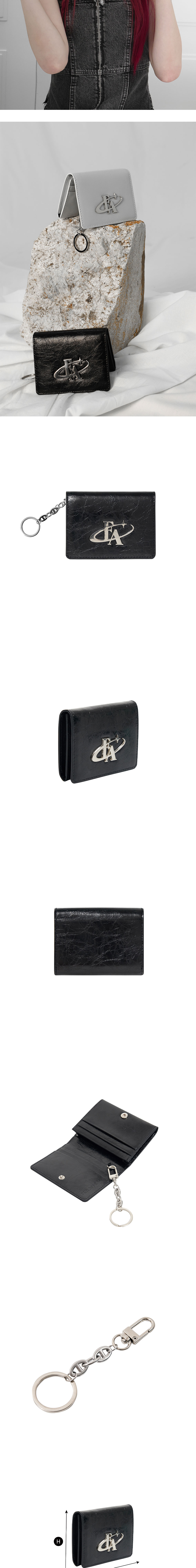 COW LEATHER SURGICAL CHAIN 카드포켓6개 , 중앙 수납칸1개 탈부착이 가능한 키링 제공 한 손에 잡히는 컴팩트한 사이즈 ‘blod logo’ 팬던트 장식이 특징인 카드지갑