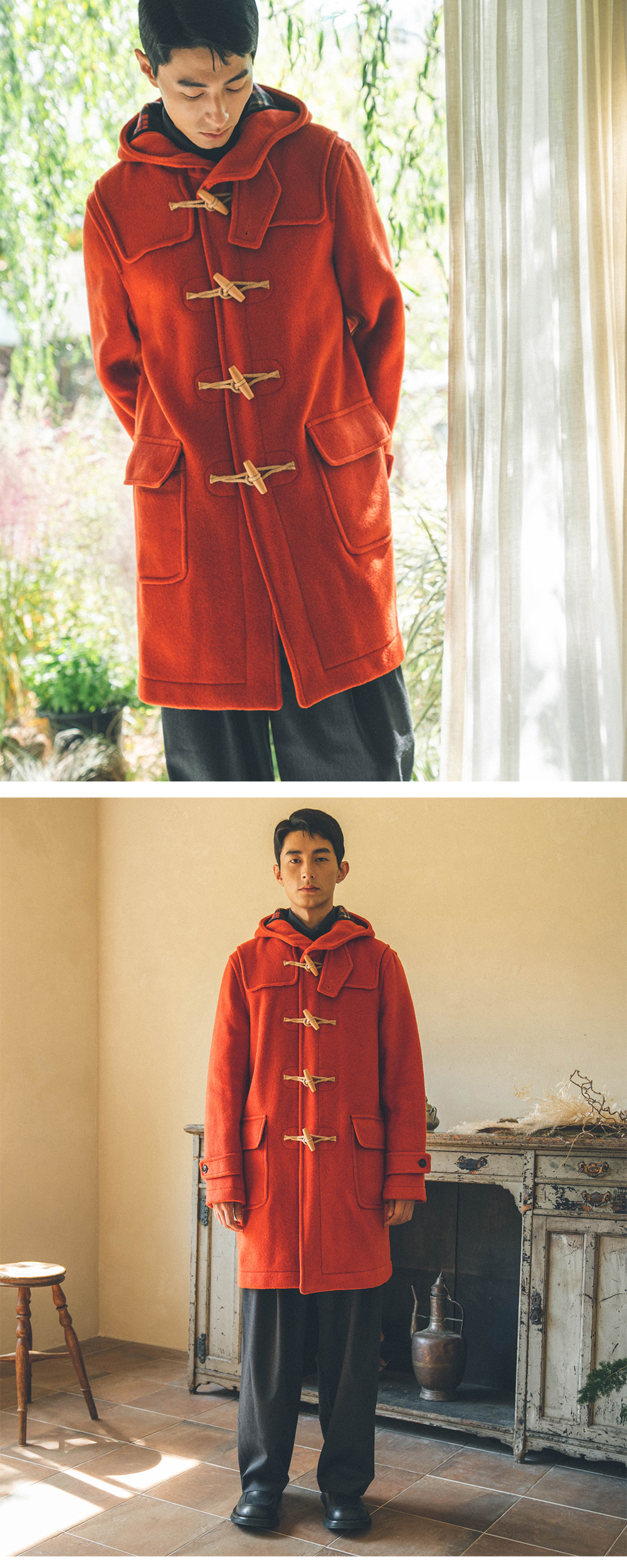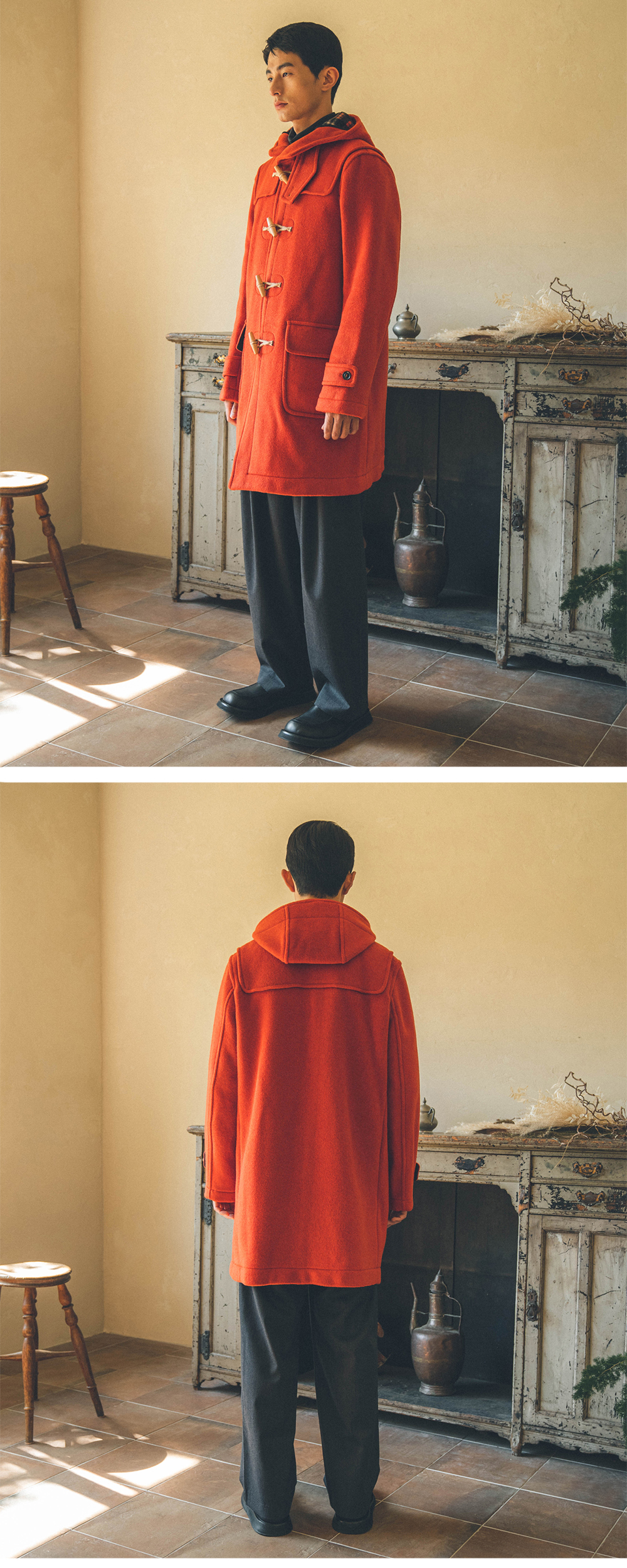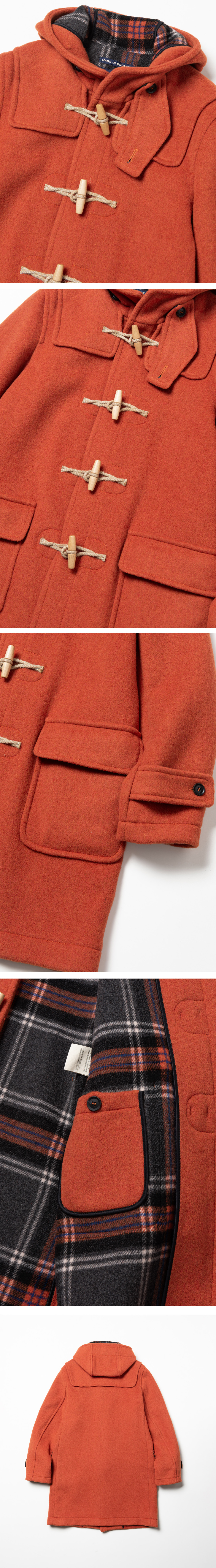 LONDON TRADITION Mens Erica Duffle Coat Orange 224 런던 트레디션 멘즈 에리카 더플 코트 오렌지 224 런던트레디션 스테디 셀러 더플 코트 어깨 요크, 나무 토글과 로프 디자인 전면 2개의 플랩 패치 포켓 1개의 이너 포켓 바인딩으로 안감 봉제 마감 더블 페이스 원단 사용 (더블 페이스 원단이란? 2개의 직물을 양면으로 제직한 원단) 이탈리아 패브릭 사용