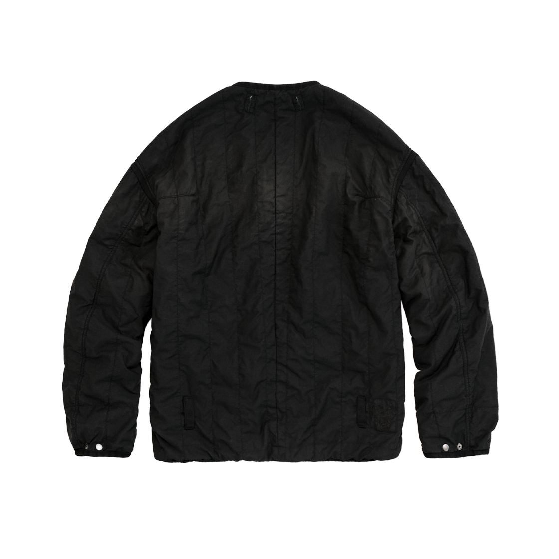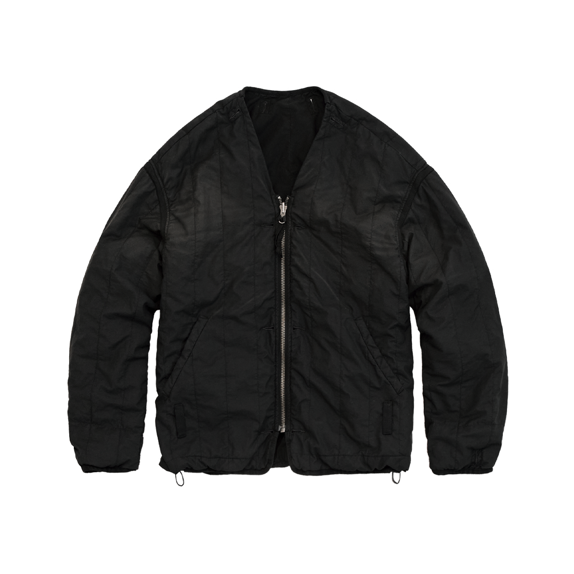 HANK reversible liner jacket - used black - 전신이 되는 quilted cardigan을 다듬은 A면과 고전적 라이너 형상의 B면으로 구성 - 부드러운 촉감과 몸에 감기는 착용감 - 복합적인 다잉과 워싱으로 깊이감 있고 자연스러운 색감 - A면: 자연광 아래 얼룩감 느껴지는 시그니처 유즈드 워싱 적용. 배색은 블리치드되어 브라운-블랙 사이의 그라데이션으로 강조, 후면 하단 행크 스모킹 독 패치. - B면: 진득한 질감의 블랙 다잉 적용, 소매의 사시코방식 핸드스티치, 엘보 패치 디자인. - 군데군데 적용된 밀리터리 테이프 디테일 - 조절 가능한 소맷단과 밑단 - 양면 자유로이 활용 가능한 리버스 지퍼 사용 - 충전재: 신슐레이트 *모델: 170 중반 / 마른 체형, 3사이즈 착용 *직전 차수 대비, 퀄팅 면의 페이딩이 자연스럽게 완성되었으며, 양면 모두 매트한 질감으로 완성되었습니다. *양쪽면 주머니 안감이 코듀로이 소재에서 제원단으로 변경되었습니다.