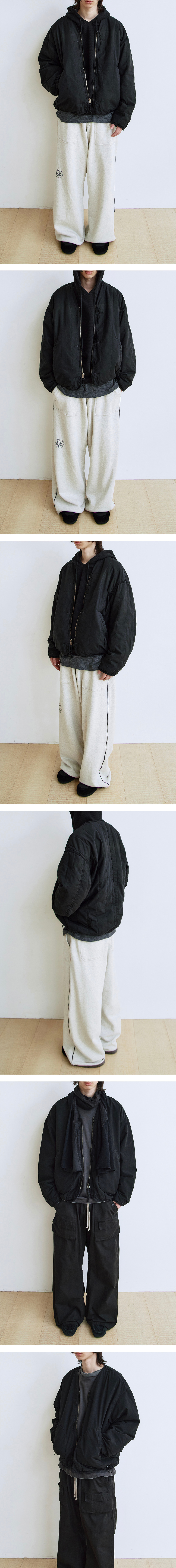 HANK reversible liner jacket - used black - 전신이 되는 quilted cardigan을 다듬은 A면과 고전적 라이너 형상의 B면으로 구성 - 복합적인 다잉과 워싱으로 깊이감 있고 자연스러운 색감 - A면: 자연광 아래 얼룩감 느껴지는 시그니처 유즈드 워싱 적용. 배색은 블리치드되어 브라운-블랙 사이의 그라데이션으로 강조, 후면 하단 행크 스모킹 독 패치. - B면: 진득한 질감의 블랙 다잉 적용, 소매의 사시코방식 핸드스티치, 엘보 패치 디자인. - 군데군데 적용된 밀리터리 테이프 디테일 - 조절 가능한 소맷단과 밑단 - 양면 자유로이 활용 가능한 리버스 지퍼 사용 - 충전재: 신슐레이트 *모델: 170 중반 / 마른 체형, 3사이즈 착용 *직전 차수 대비, A면의 워싱감 대비를 낮춰서 완성했으며, B면 엘보 패치를 한 톤 낮게 완성했습니다.