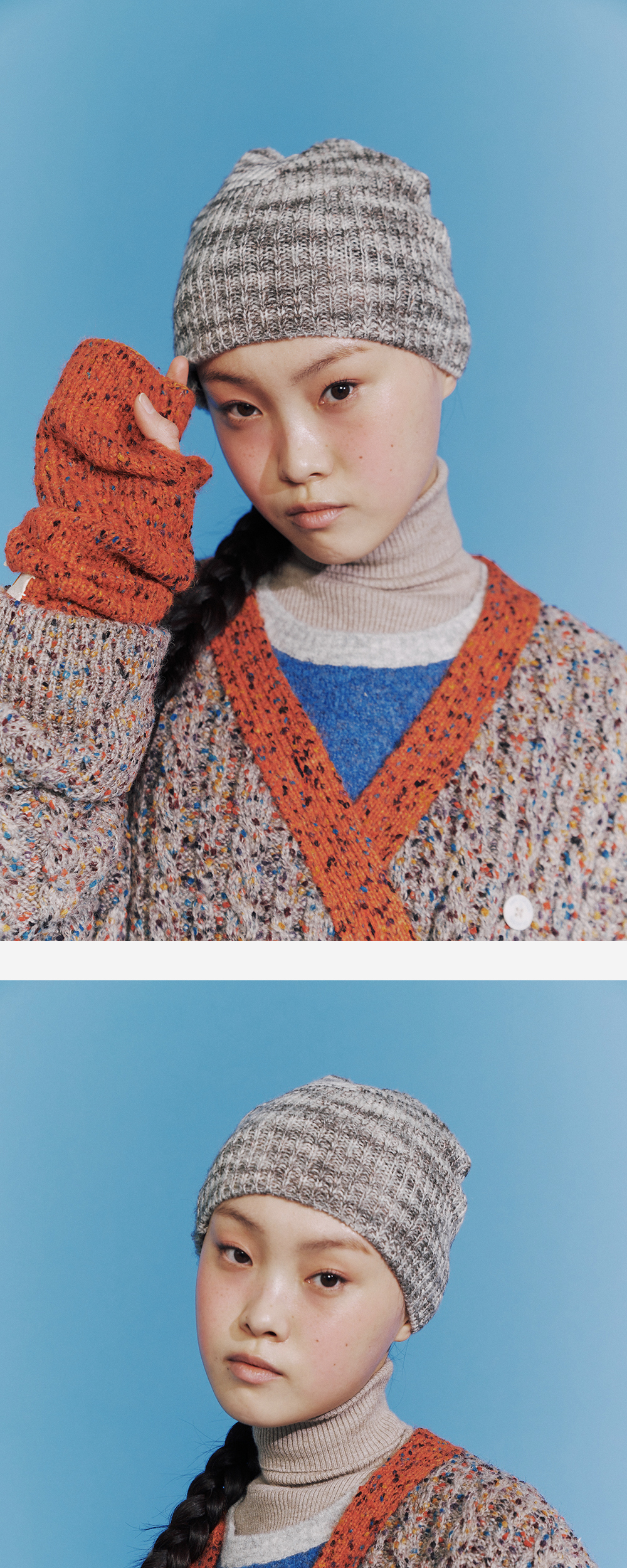 * 얇고 가벼운 울, 모헤어 혼방 소재로 환절기에 착용하기 적합한 비니입니다. * 사이드의 컬러 블록이 특징입니다.