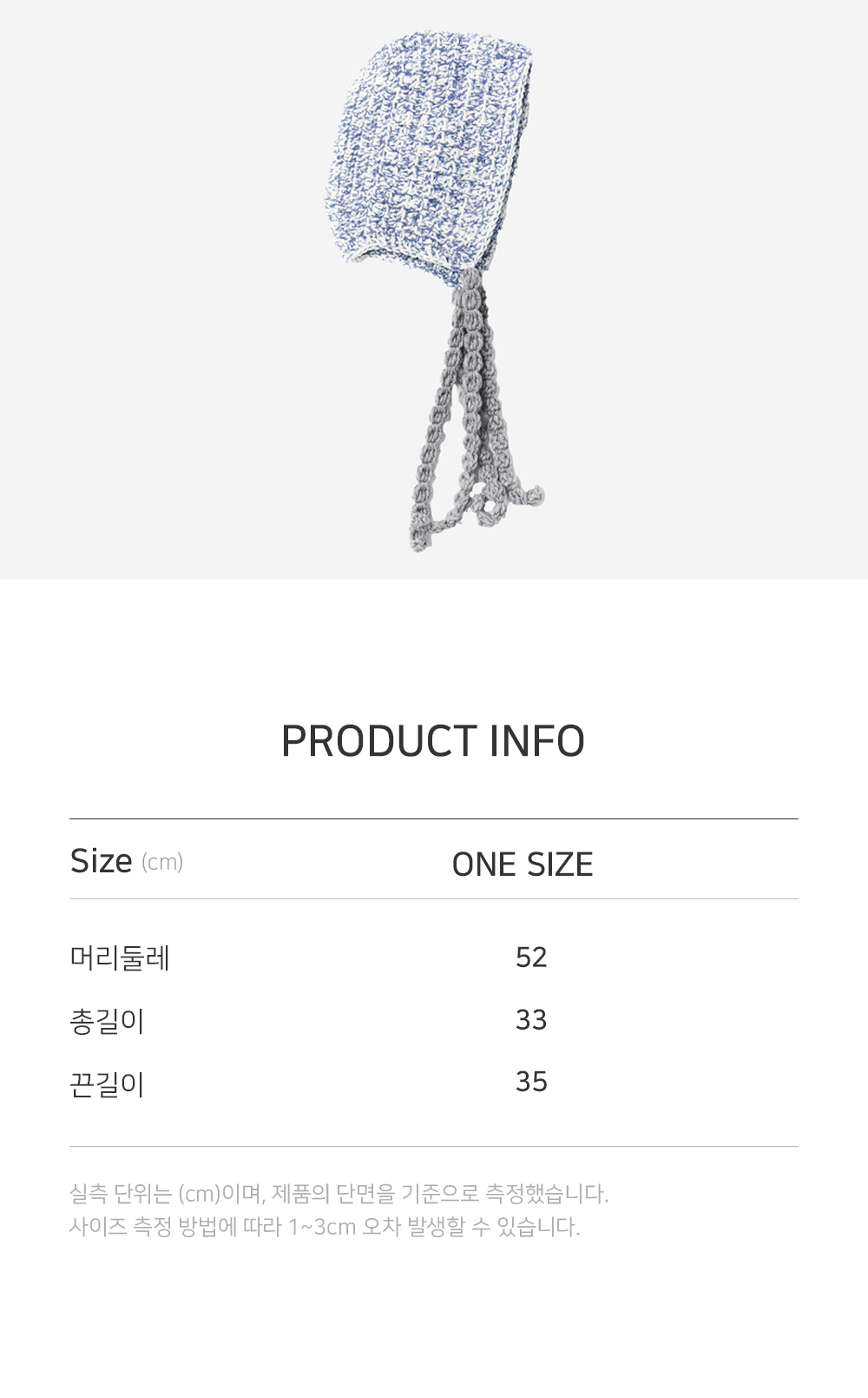 니트짜임의 구조에 따라 제품 사이즈가 1~2cm 정도 차이 날 수 있습니다.