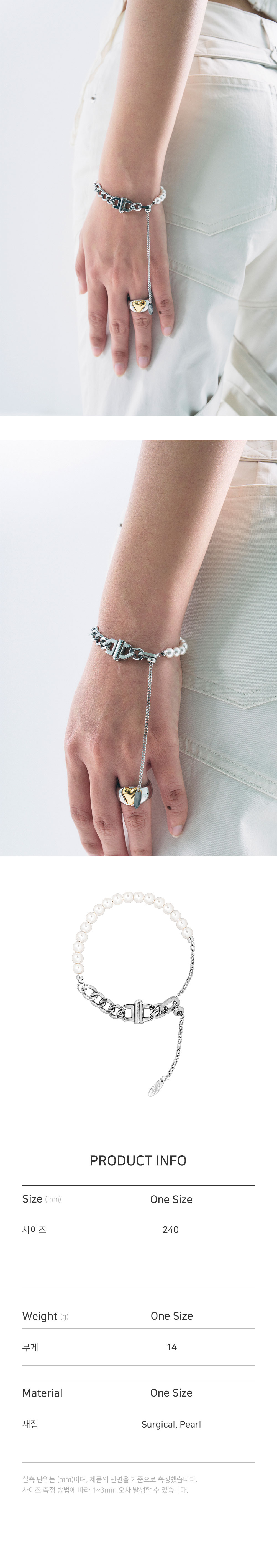 • 길이: 최대 24CM (FREE) • 무게(WEIGHT): 14G • 사이즈 조절 가능 • 오스트리아 핵진주 • 누름 버튼 장식 • 제조국: 대한민국 • 부드러운 천으로 닦아 관리 • 소재: 써지컬(SURGICAL) 30% 핵진주(PEARL) 70%