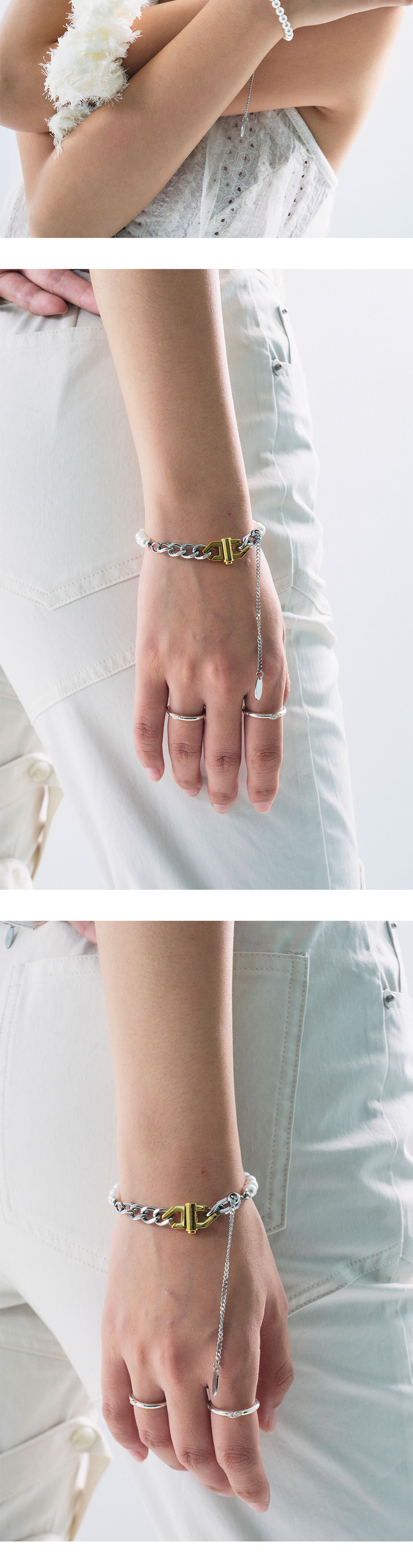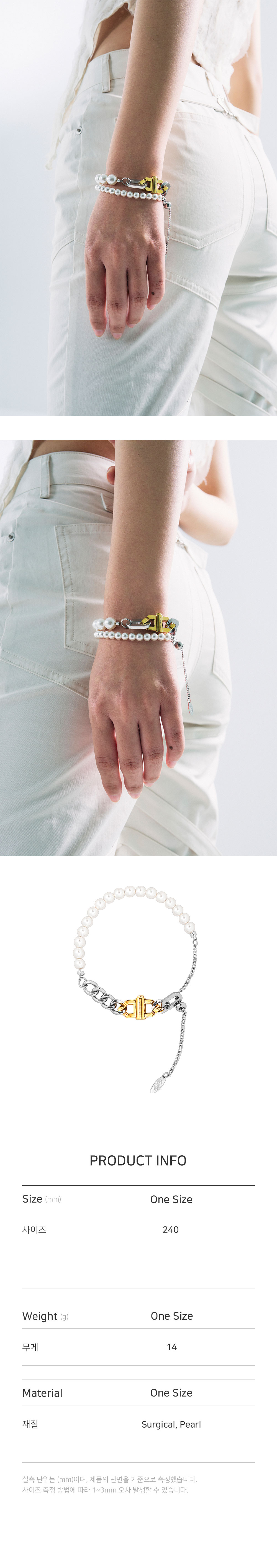 • 길이: 최대 24CM (FREE) • 무게(WEIGHT): 14G • 사이즈 조절 가능 • 오스트리아 핵진주 • 누름 버튼 장식 • 제조국: 대한민국 • 부드러운 천으로 닦아 관리 • 소재: 써지컬(SURGICAL) 30% 핵진주(PEARL) 70%