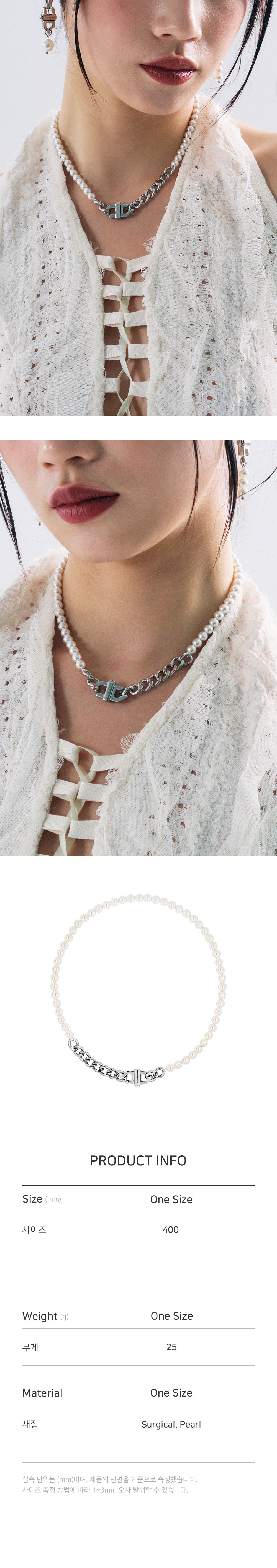 • 길이: 최대 40CM • 무게(WEIGHT): 25G • 누름 잠금 장식 • 오스트리아 핵진주 • 제조국: 대한민국 • 부드러운 천으로 닦아 관리 • 소재: 써지컬(SURGICAL) 30% 핵진주(PEARL) 70%