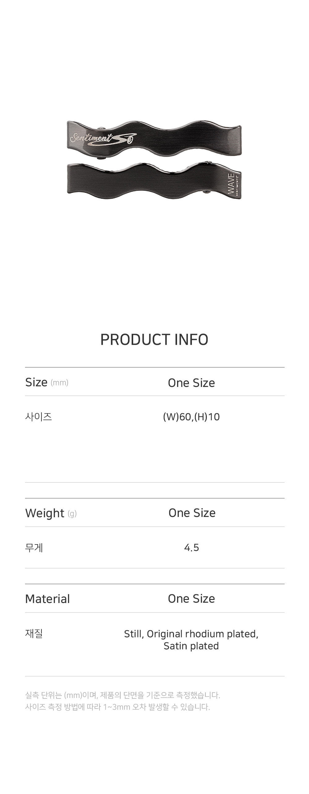 • 크기: 가로(W) : 6CM / 세로(H) 1CM • 무게(WEIGHT): 4.5G • SENTIMENTS 2023 F/W WAVE HAIR PIN • 2SET • SENTIMENTS 23 S/S 자체 디자인 • 사틴 도금으로 고운 표면 처리 • 제조국: 대한민국 • 부드러운 천으로 닦아 관리 소재: 철(STILL) 100% OR두께도금(ORIGINAL RHODIUM PLATED) 사틴도금(SATIN PLATED)