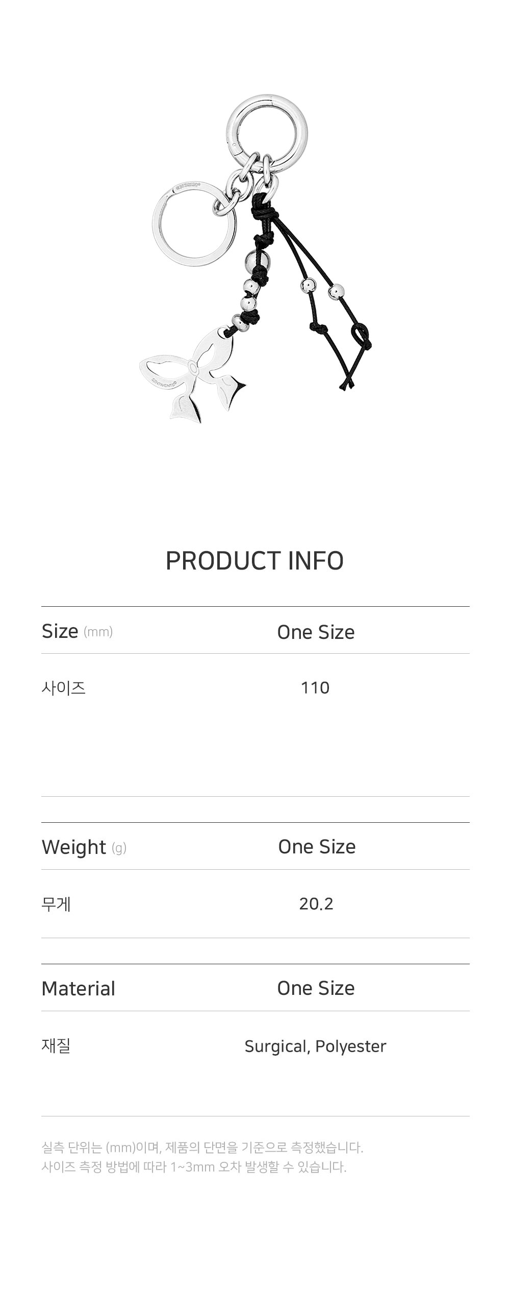• 크기: 링 가로(W) 2.4CM X 세로(H) 2.4CM 길이 11CM • 무게(WEIGHT): 20.2G • SENTIMENTS 23 F/W 자체 제작 리본 펜던트 • 사이즈 길이 조절 가능 • 이동 조절 장식 • 제조국: 대한민국 • 부드러운 천으로 닦아 관리 소재: 써지컬(SURGICAL) 80% 폴리에스터(POLYESTER) 20%