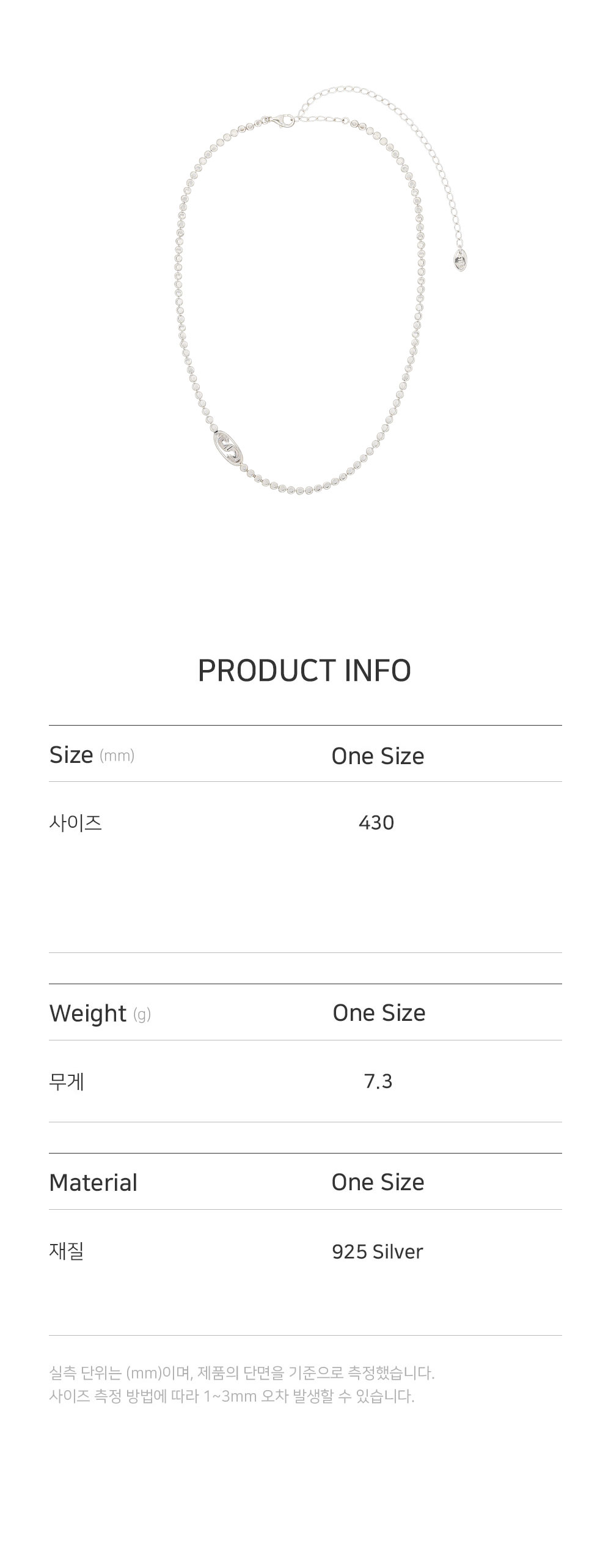 • 길이: 최대 38CM + 5CM 펜던트 가로(W)1.4CM X 세로(H)0.8CM • 무게(WEIGHT): 7.3G • SENTIMENTS 2023 F/W 자체 제작 로고 펜던트 • 925 실버 누름볼 체인 • 무도금 • 은 폴리싱천 포함 • 제조국: 대한민국 • 부드러운 천으로 닦아 관리 • 소재: 925 실버(925 SILVER) 100%
