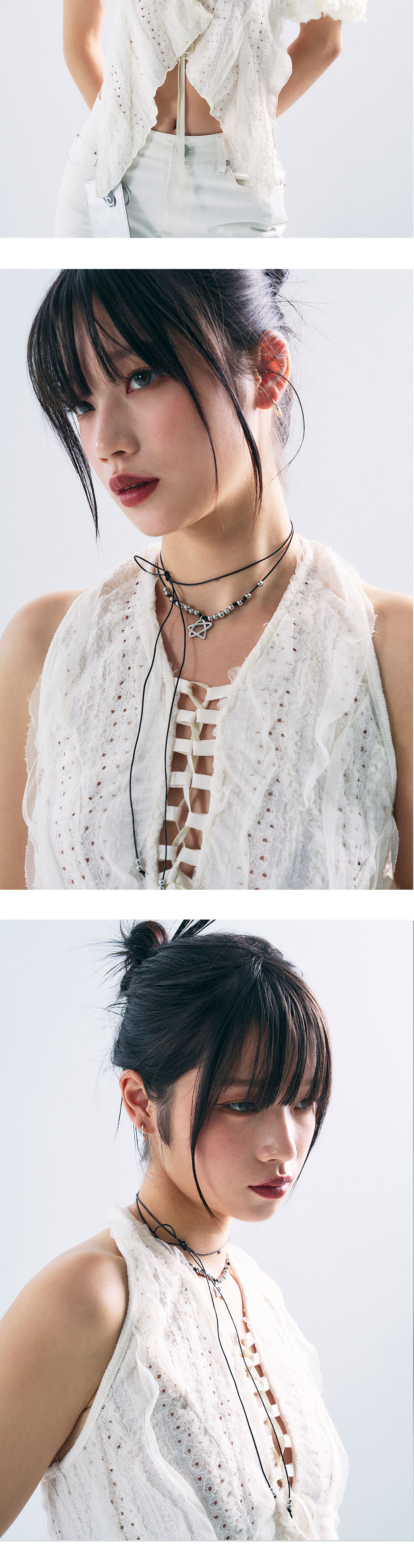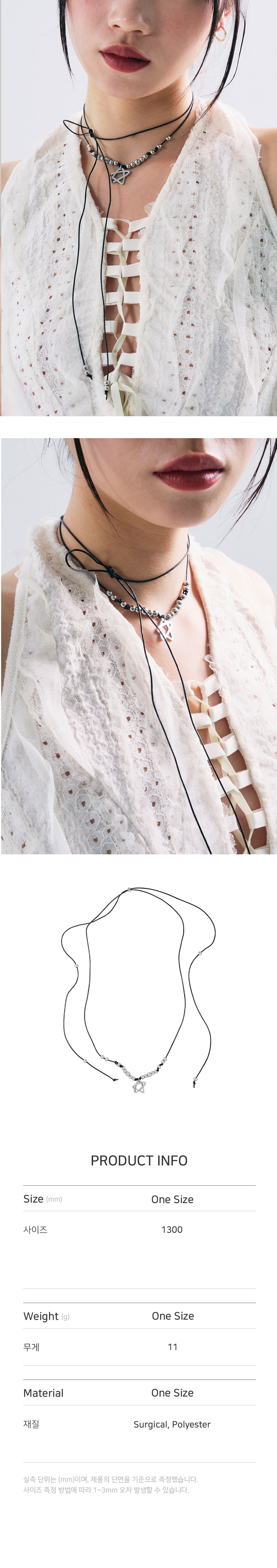 • 길이: 최대 130CM 펜던트 가로(W)1.5CM X 세로(H)1.5CM • 무게(WEIGHT): 11G • SENTIMENTS 2023 F/W 자체 제작 별 펜던트 • 사이즈 조절 가능 • 이동조절 장식 • 제조국: 대한민국 • 부드러운 천으로 닦아 관리 • 소재: 써지컬(SURGICAL) 90% 폴리에스터(POLYESTER) 10%