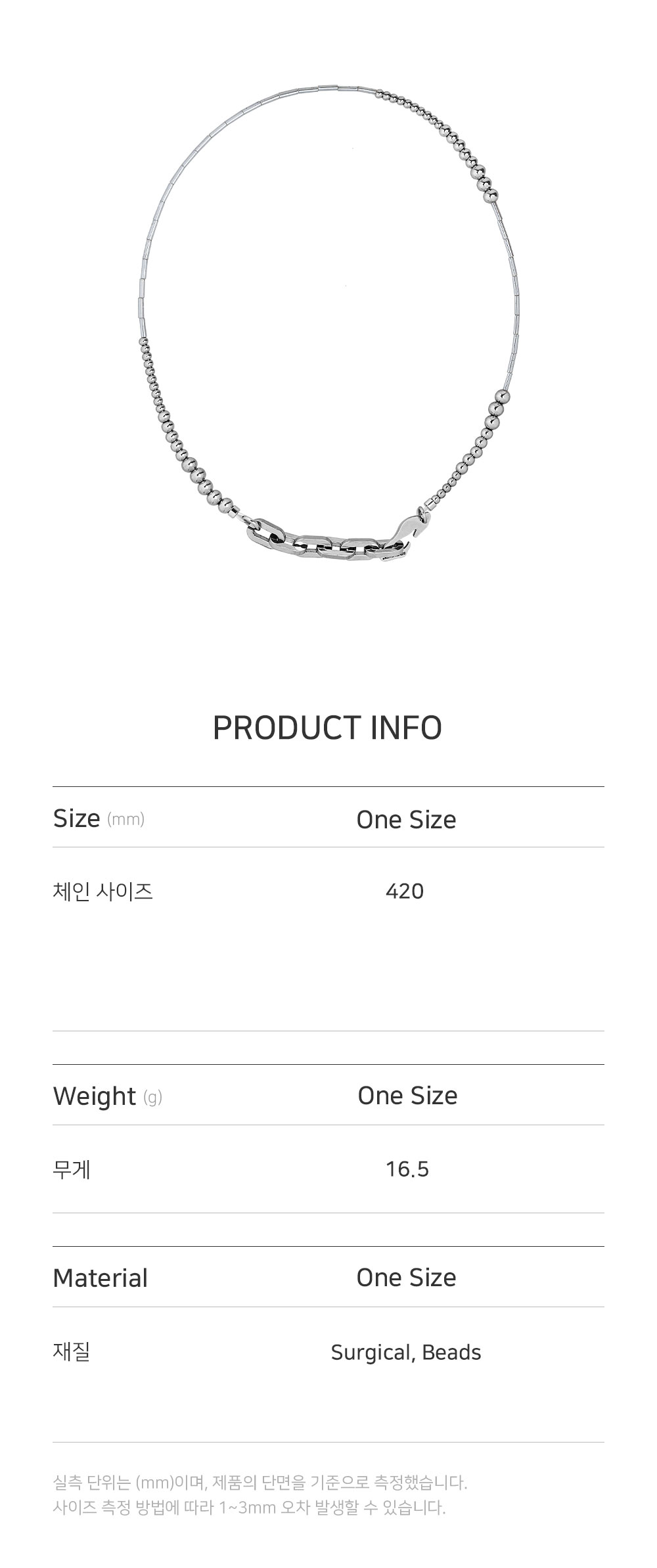• 길이: 42CM • 무게(WEIGHT): 16.5G • 후크 장식으로 탈부착 • 미유키비즈 • 제조국: 대한민국 • 부드러운 천으로 닦아 관리 • 소재: 써지컬(SURGICAL) 90% 비즈(BEADS) 10%