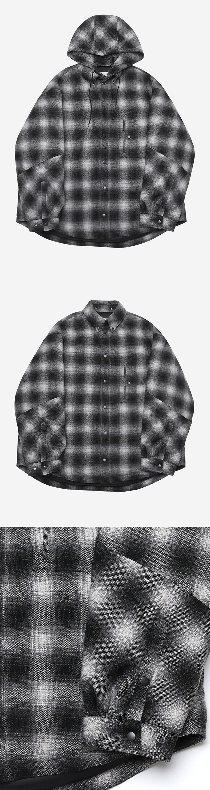 오버사이즈 실루엣의 패디드 후드 셔츠 자켓입니다. 박시한 실루엣으로 편하게 입기 좋은 제품입니다. *1사이즈-세미오버핏 / 2사이즈-슈퍼오버핏으로 3치수정도 차이가 납니다. 적당한 오버핏 선호하시면 1사이즈 추천드립니다. **실측 참고 부탁드립니다** -DETAIL- 1.소매 밑단 절개/후드/등판 사선 방향 체크로 포인트 2.등판 투 플리츠 디테일 3.사이드라인 절개 4.팁 작업 처리된 코팅 끈과 금속 스토퍼로 포인트 5.카펜더포켓 6.후드 탈부착 가능 7.안감 5온스 패딩으로 한겨울까지 착용 가능 -COMPOSITION- 폴리에스테르 100% 안감-폴리에스테르100% YKK japan 스냅 단추 -model- mid long hair185/65 2사이즈 착용 mid hair183/63 2사이즈 착용