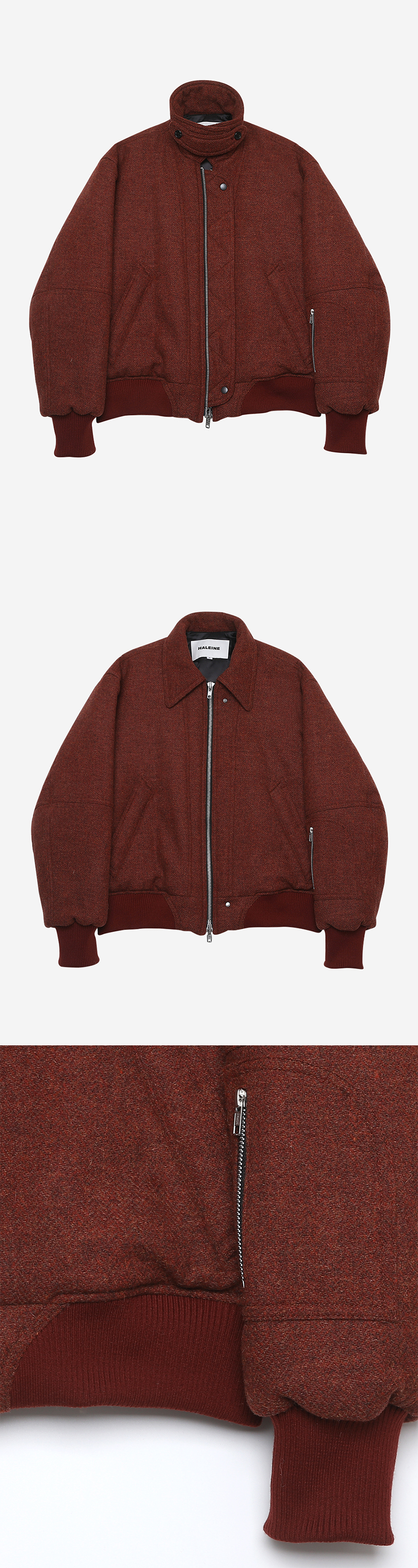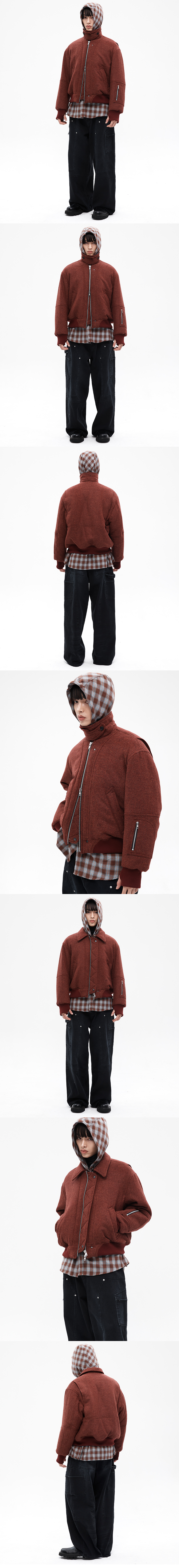 카라 비조를 이용하여 하이넥과 카라 두 가지 스타일로 연출 가능한 블루종입니다. 울 원단에 3온스 하스 솜 패딩 처리 3온스 패딩 안감을 사용하여 볼륨감 있는 실루엣이 연출됩니다. 세미 오버핏 실루엣에 균형감이 좋아 데일리로 편하게 입기 좋습니다. *3온스 압축 하스 솜을 충전하여 한겨울 착용 가능합니다** -DETAIL- 1.소매 시보리 핑거 홀 디테일 2.입체 절개 3.등판 폴딩 액션 플리트 디테일 4.2way 스냅 플라켓 디테일 5.,소매 하단 카고 포켓 디테일 6.라운딩 시보리 디테일 -COMPOSITION- 울100% /lining-폴리에스테르 100% /YKK 2way 엑셀라 zipper(japan)/YKK snap(japan)/필링을 최소화한 최고급 면 시보리 -model- mid long hair185/65 2사이즈 착용 mid hair183/63 2사이즈 착용