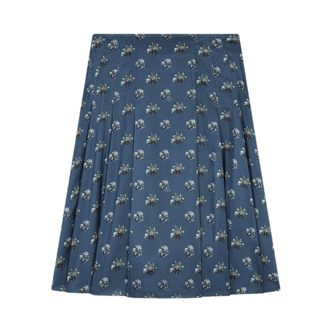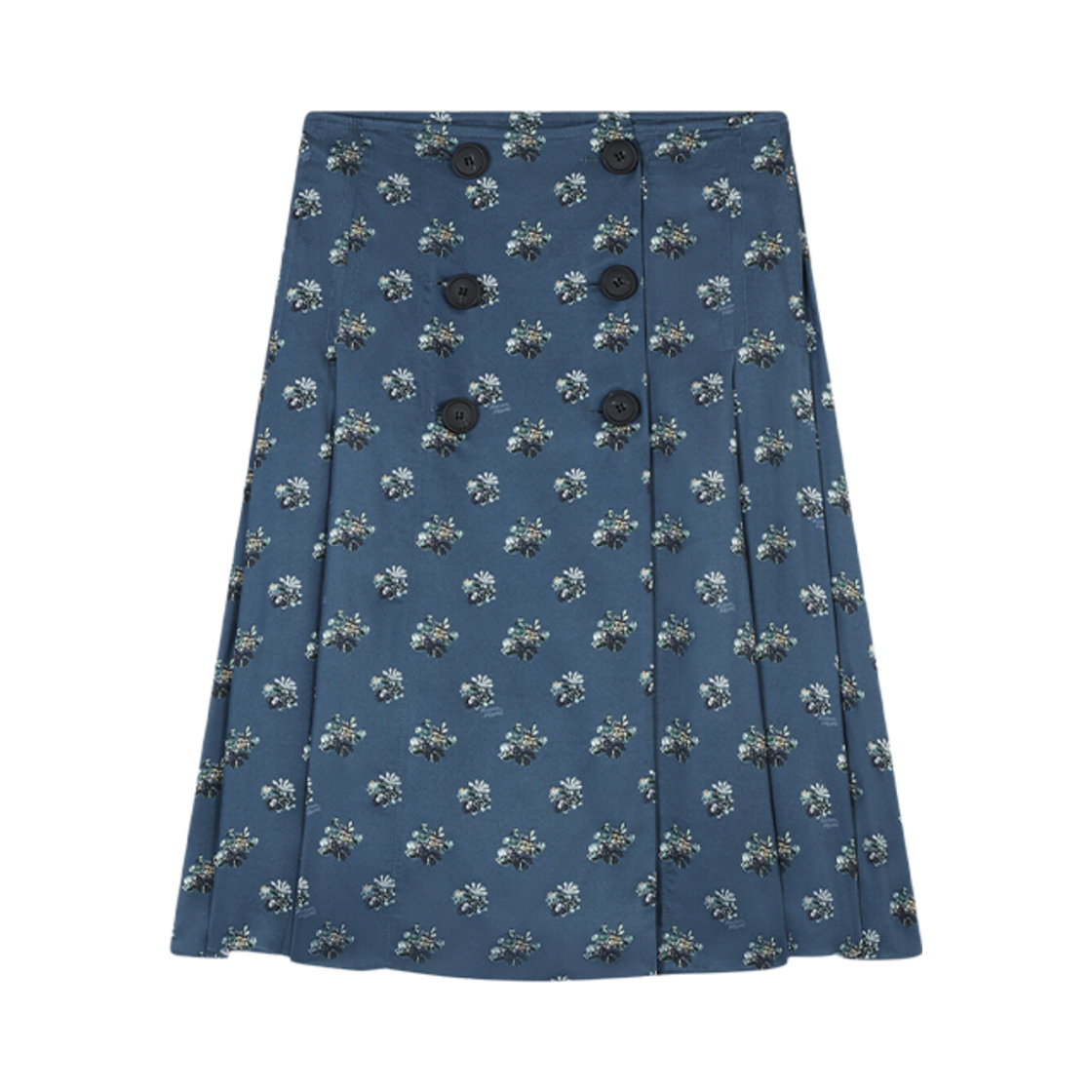 (W) 메종 키츠네 니 플리츠 랩 스커트 플로럴 프린티드 비스코스 데님 블루 부케 올오버