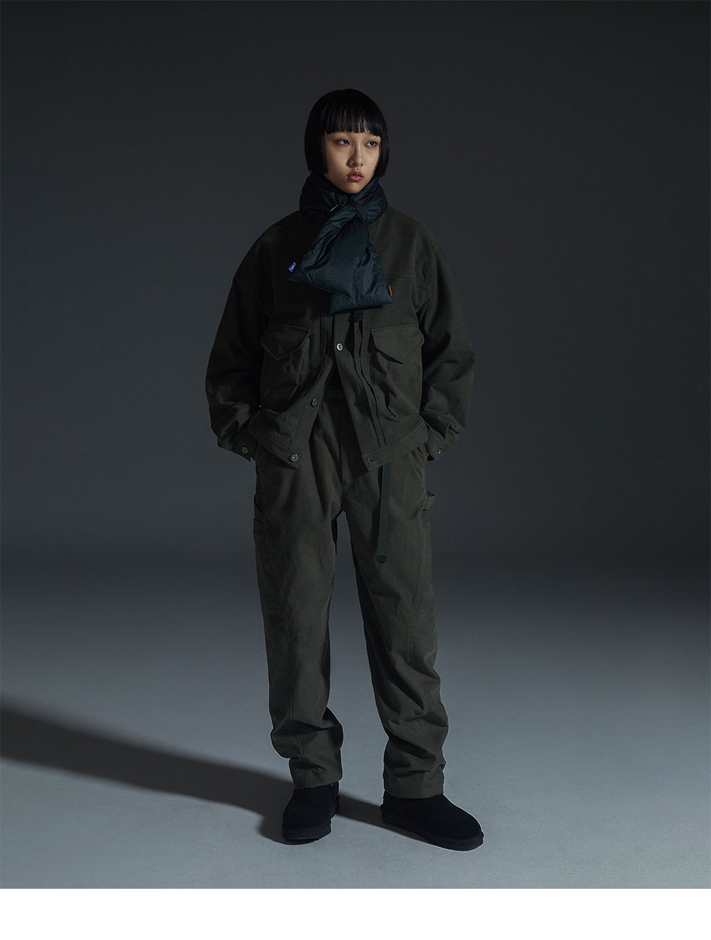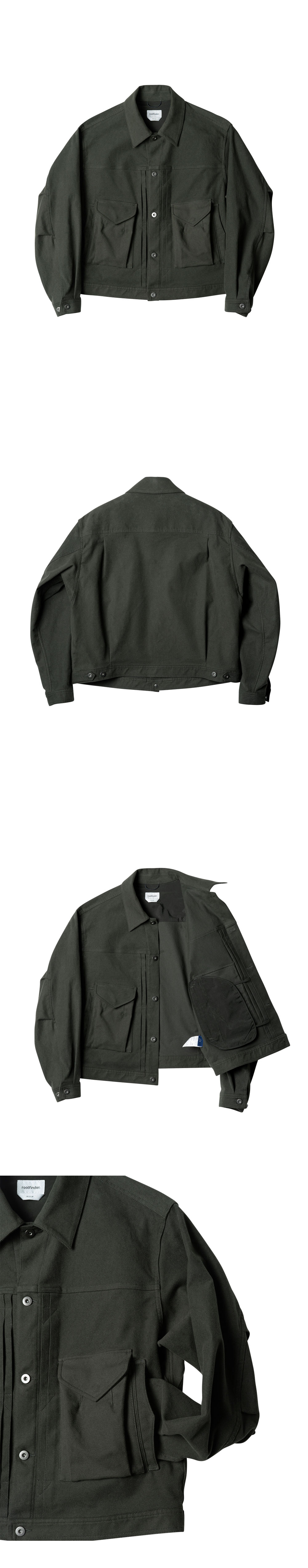 - 2세대 트러커 재킷의 요소를 입체적으로 재해석. - 숏트한 기장의 래귤러 실루엣. - 컨버터블 칼라 디자인으로 오픈하거나, 채워서 연출. - 트라이앵글 슬리브 설계로 편안한 활동성과 소매 2 턱 디테일로 볼륨감 연출. - 소매 커프스, 허리 벨트에 실루엣 조절이 가능한 어저스터 디테일. - 전면의 입체 포켓과 사이드 핸드 워머 포켓으로 수납력 극대화. - 코튼 95%, 폴리우레탄 5%의 이탈리아 몰스킨 소재로 부드럽고 따뜻한 터치가 특징. *보이후드 팬츠 / 딥 올리브 제품과 셋업으로 연출할 수 있습니다.