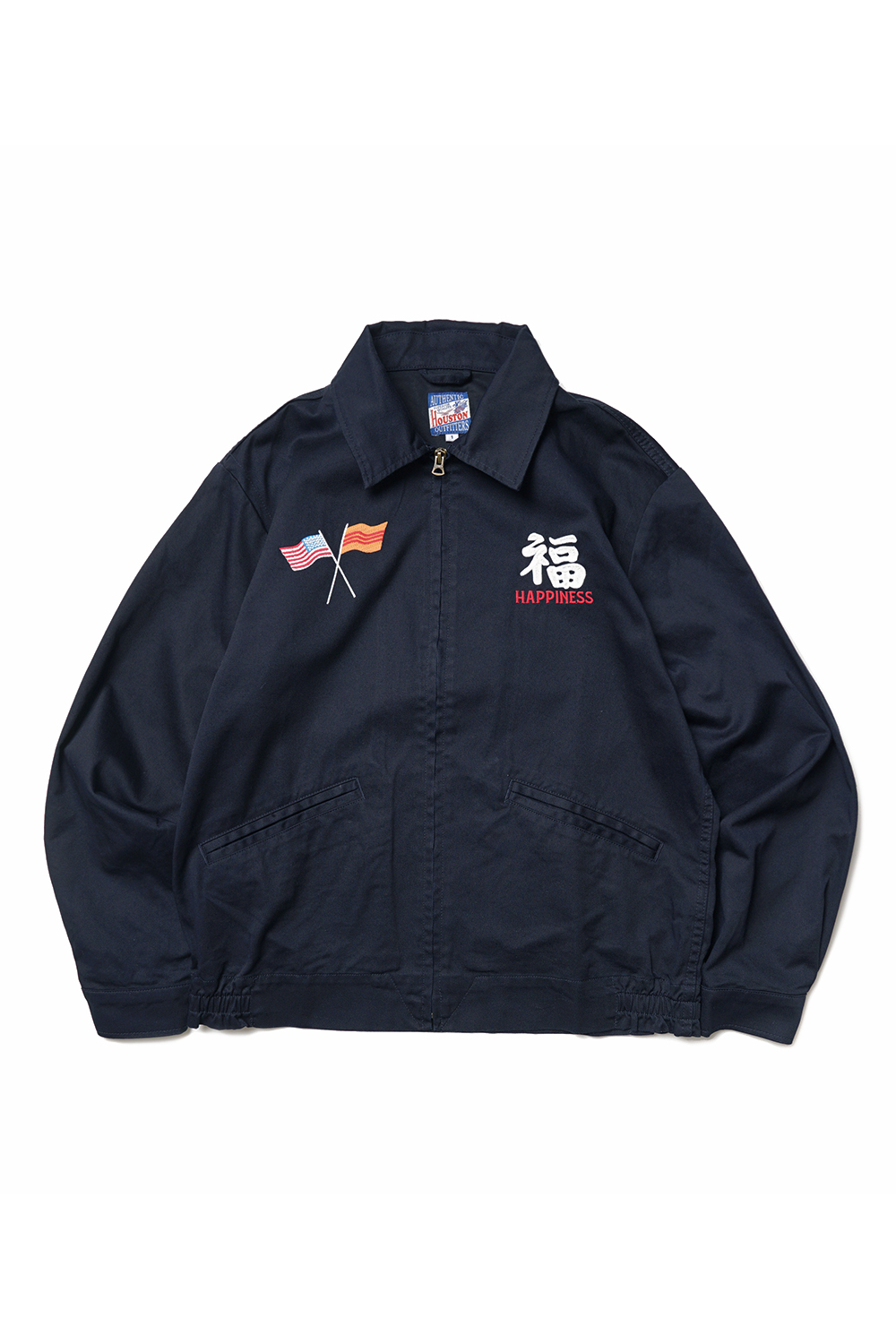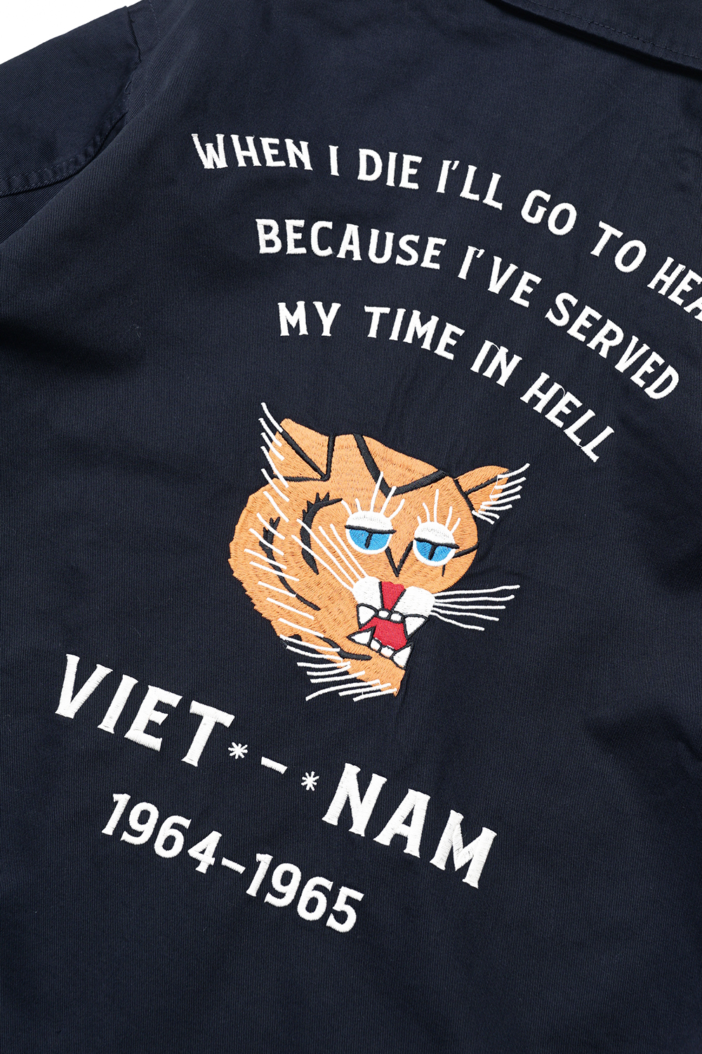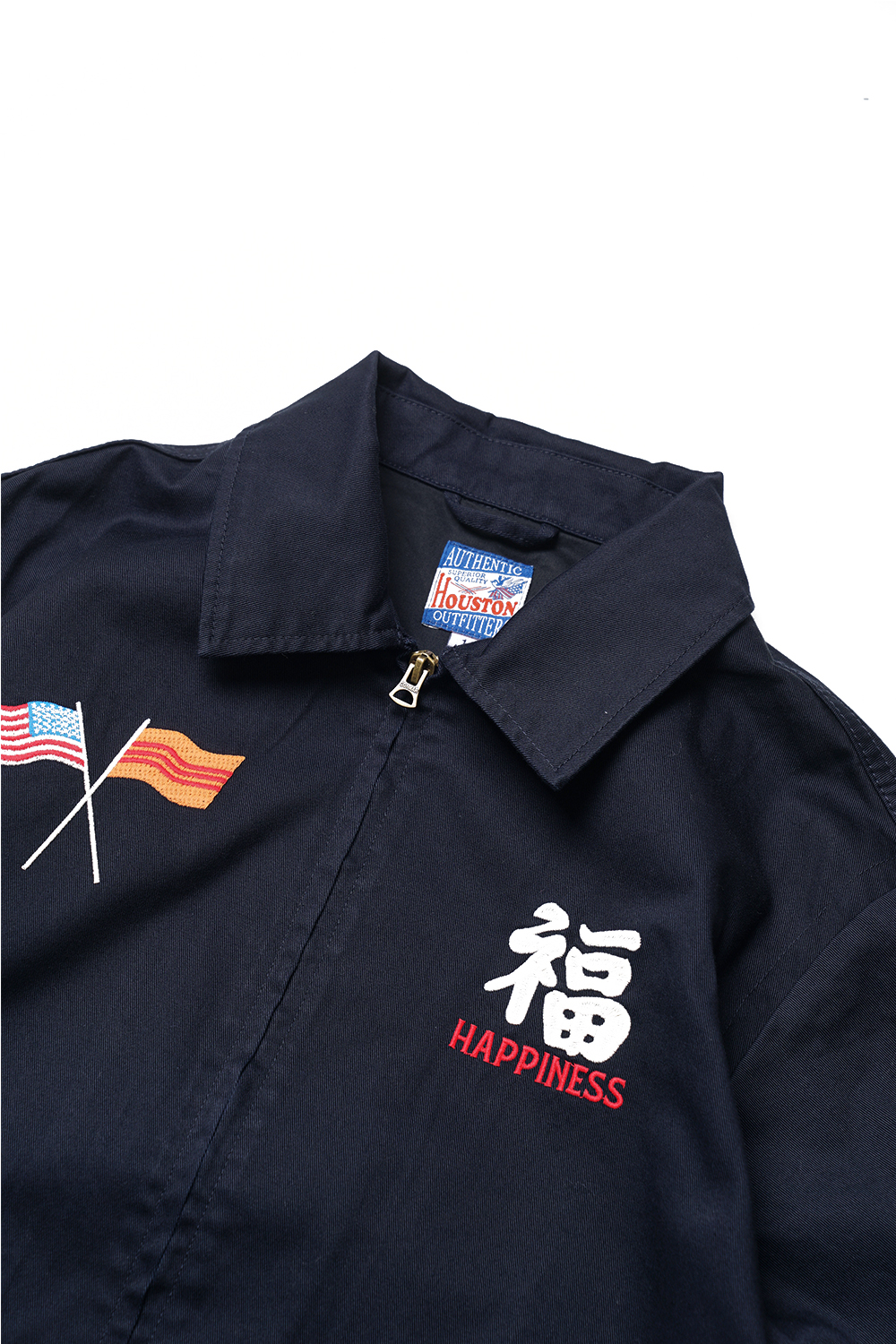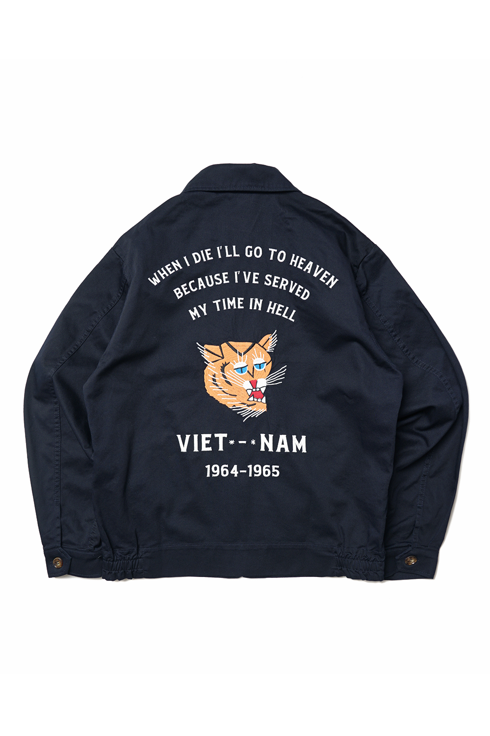 Houston Ladies 23hl074 Vietnam Jacket (Tiger) - Navy 화려한 컬러감의 코튼 능직을 사용하여 제작된 베트남 자켓입니다. 프론트는 집업 사양이며, 가슴의 양측으로 깃발과 한자 복(福)이 자수되어 있습니다. 후면부의 중앙에는 큰 형태의 호랑이 자수가 되어 있습니다.