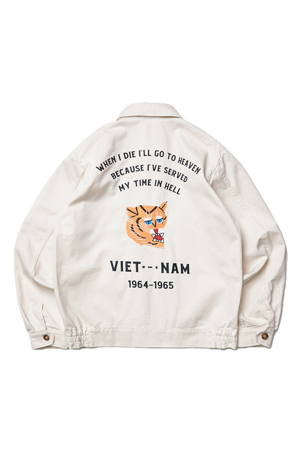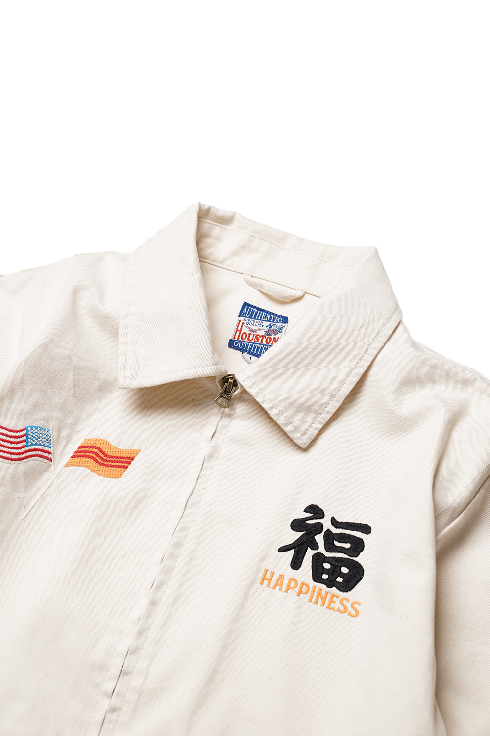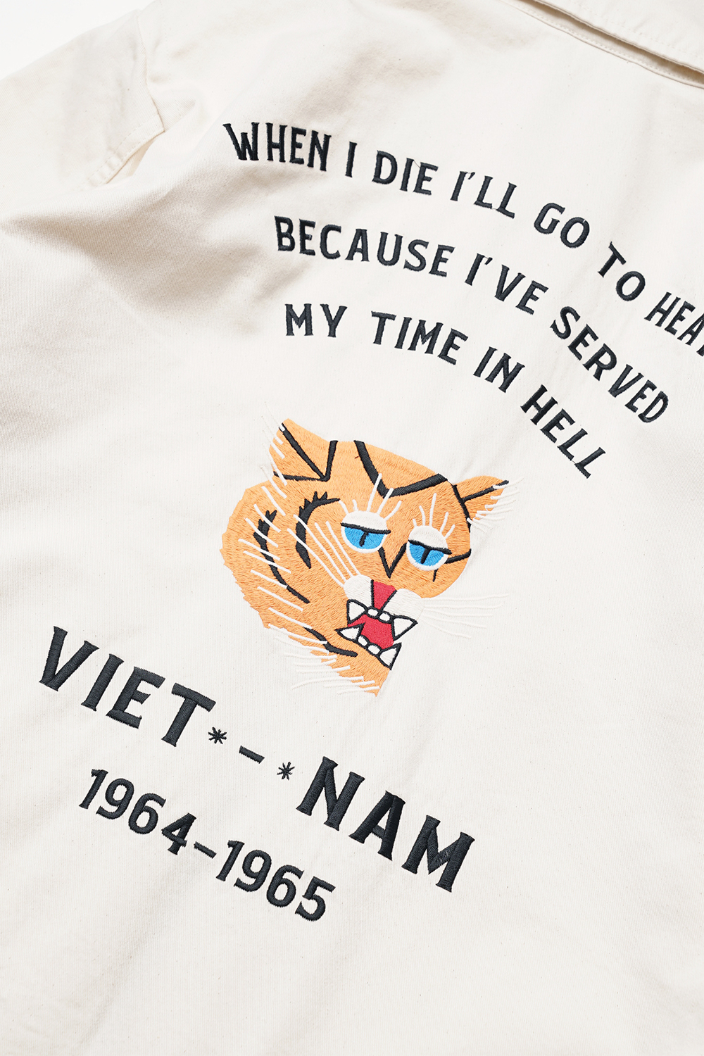 Houston Ladies 23hl074 Vietnam Jacket (Tiger) - Natural 화려한 컬러감의 코튼 능직을 사용하여 제작된 베트남 자켓입니다. 프론트는 집업 사양이며, 가슴의 양측으로 깃발과 한자 복(福)이 자수되어 있습니다. 후면부의 중앙에는 큰 형태의 호랑이 자수가 되어 있습니다.