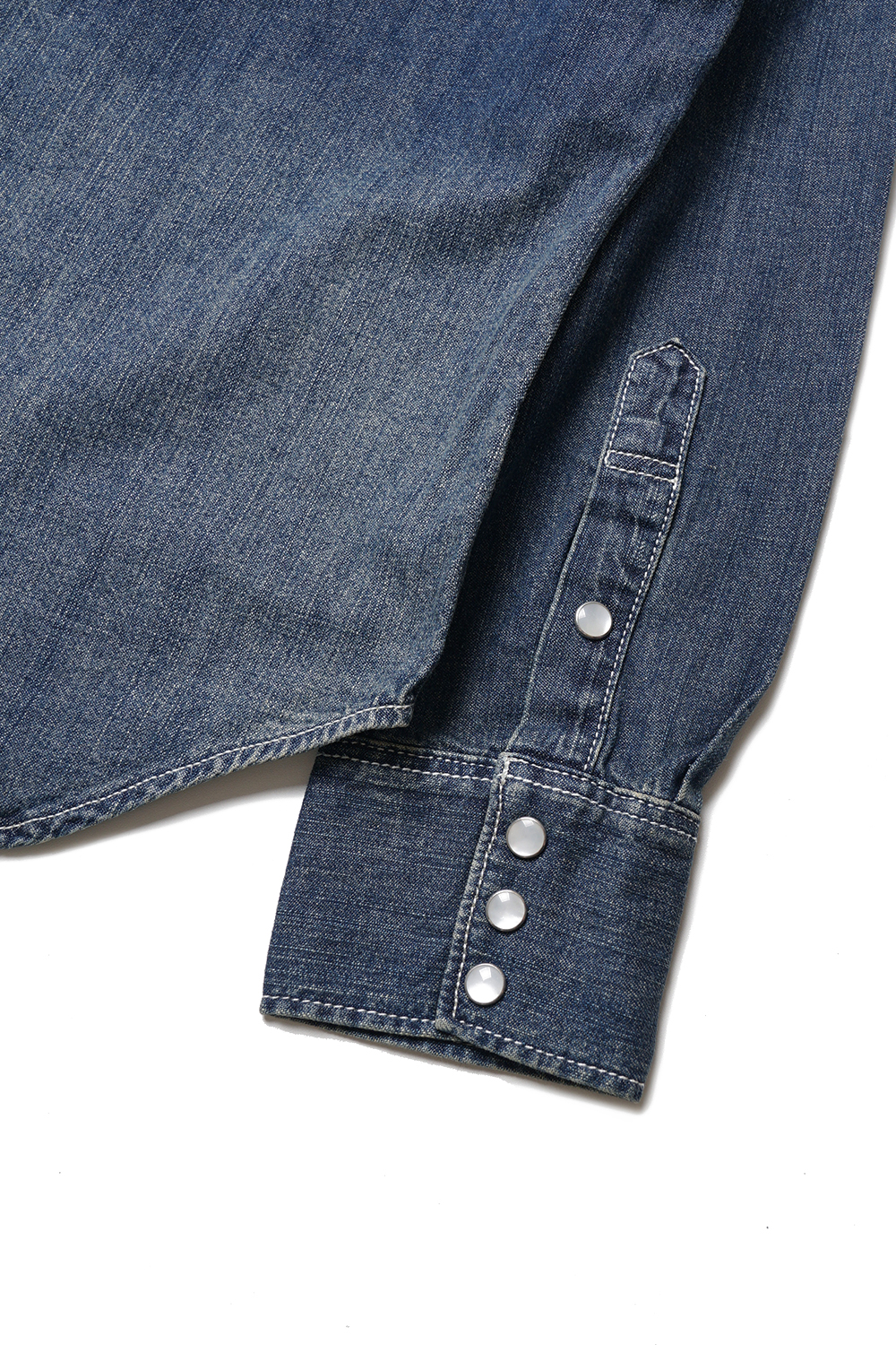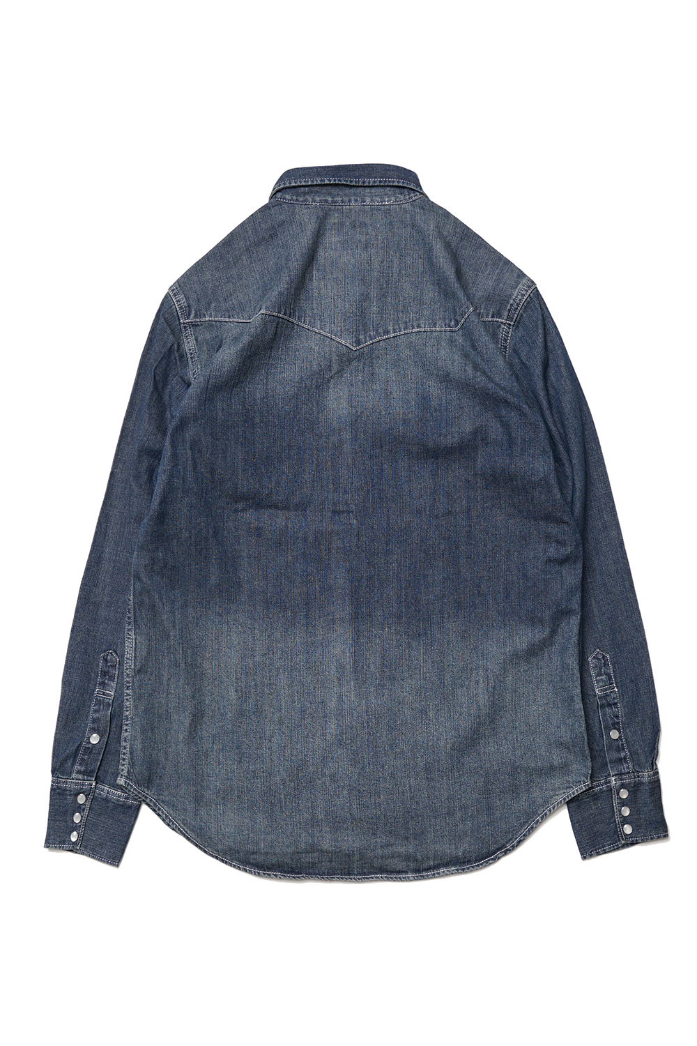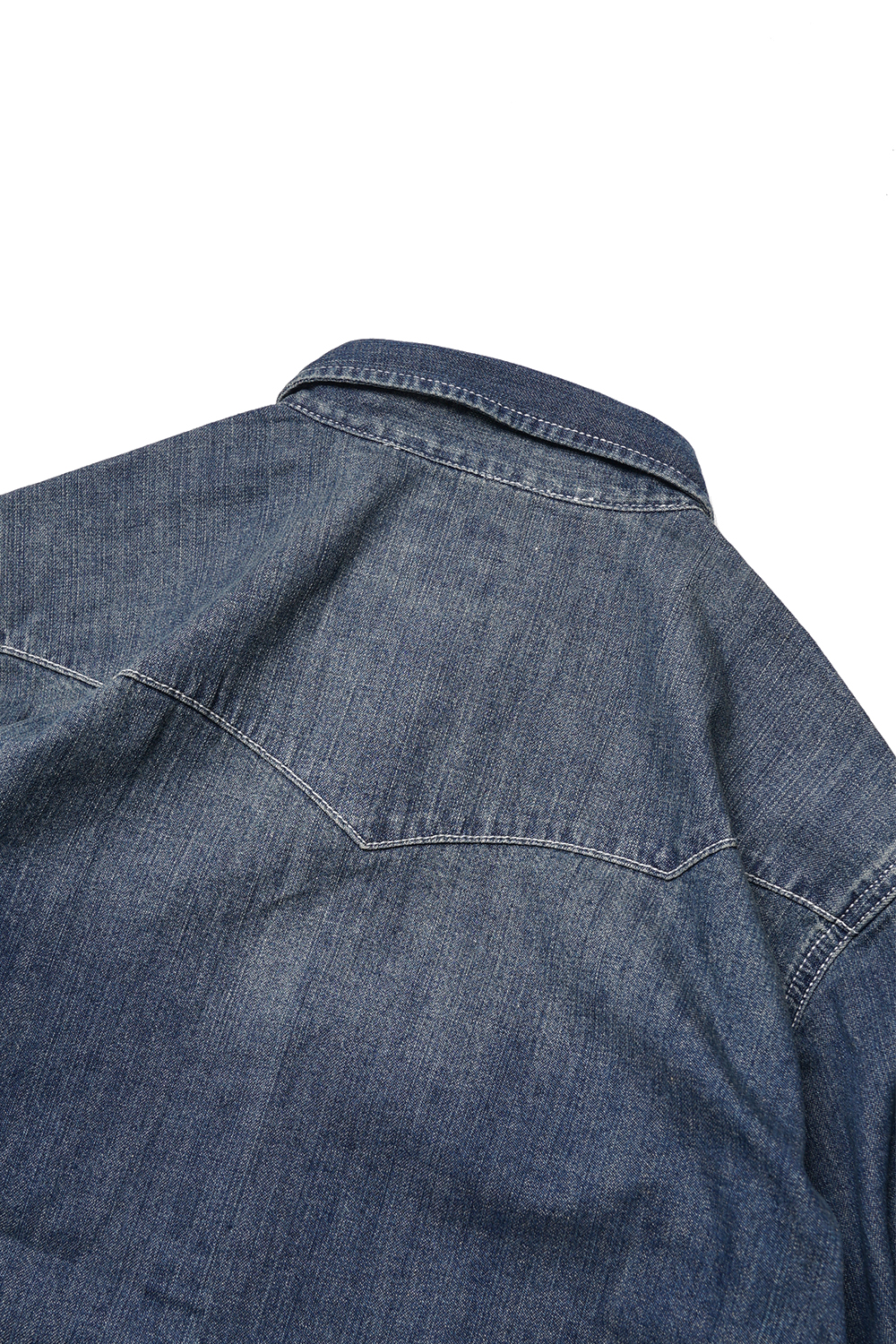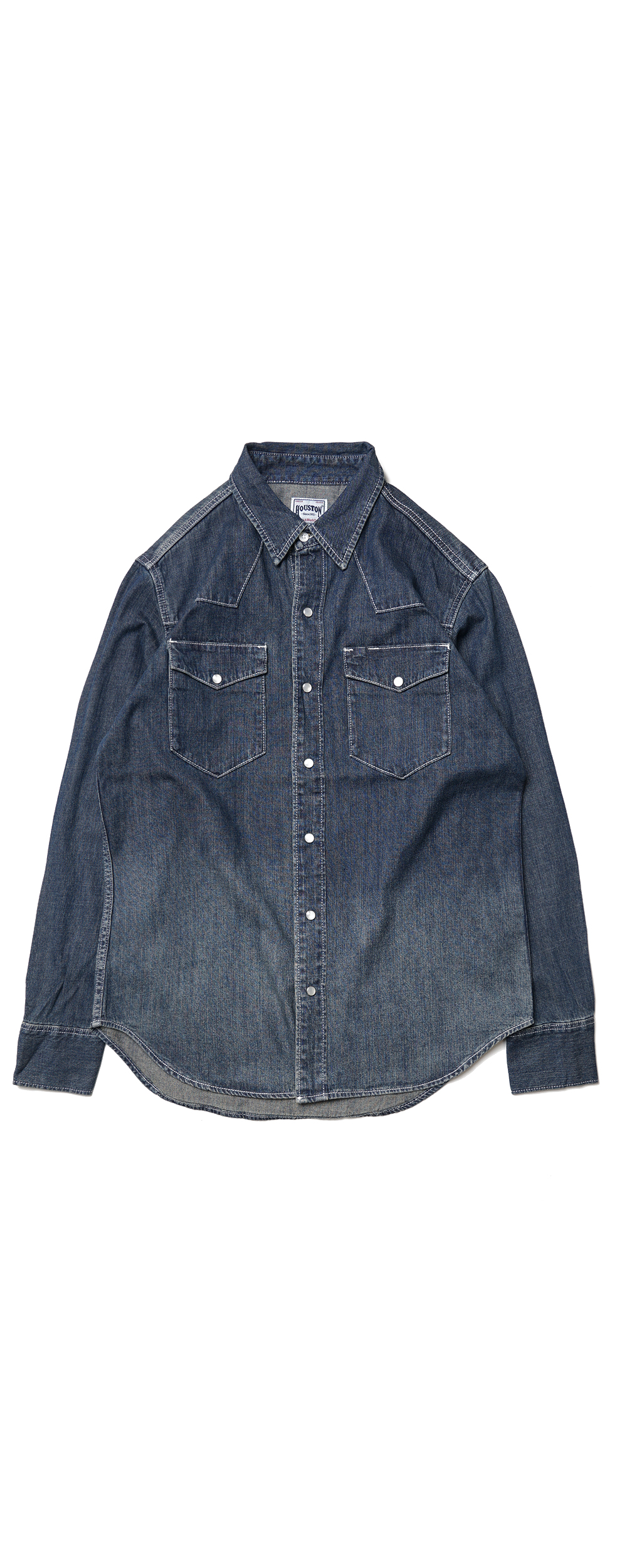 Houston Japan 40695 USA Cotton Denim Western Shirt - Indigo Vintage Wash 어깨 부분의 숄더 요크가 특징적인 웨스턴 데님 셔츠입니다. 셔츠의 경우 통상적으로 일반 버튼을 사용하지만, 웨스턴 셔츠는 낙마시, 말에게서 피하기 쉽도록 스냅 버튼을 채용하고 있습니다. 양측 가슴에도 스냅 버튼이 디자인된 플랩 포켓이 위치해 있는데 좌측 포켓에는 플랩을 닫은 상태에도 펜을 수납 가능하도록 디자인되어 있습니다. 소매는 스냅 버튼의 트리플 버튼과 건틀릿 버튼을 디자인하여 착용감을 더해줍니다. 외부의 마찰이나 부하가 걸리기 쉬운 부분은 더블 스티치 봉제를 하였습니다. 등부분의 요크는 웨스턴 셔츠의 특징인 아치형으로 디자인 되었으며 밑단은 라운드컷 형태입니다.