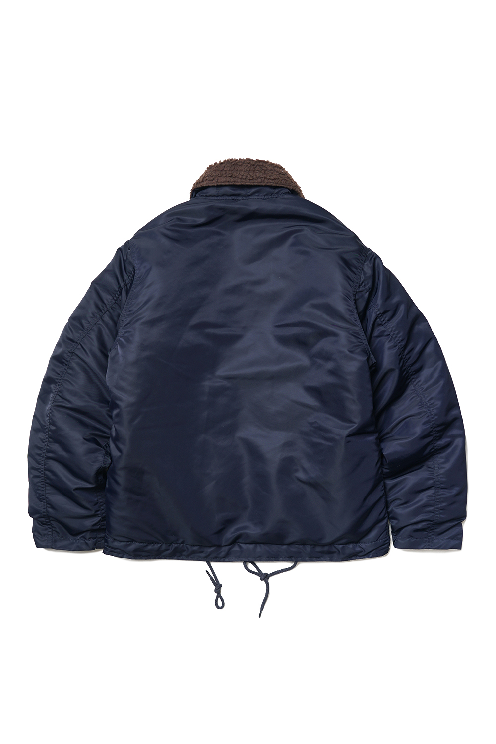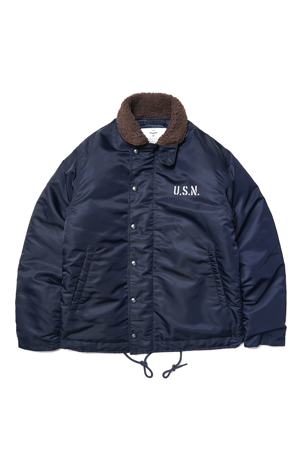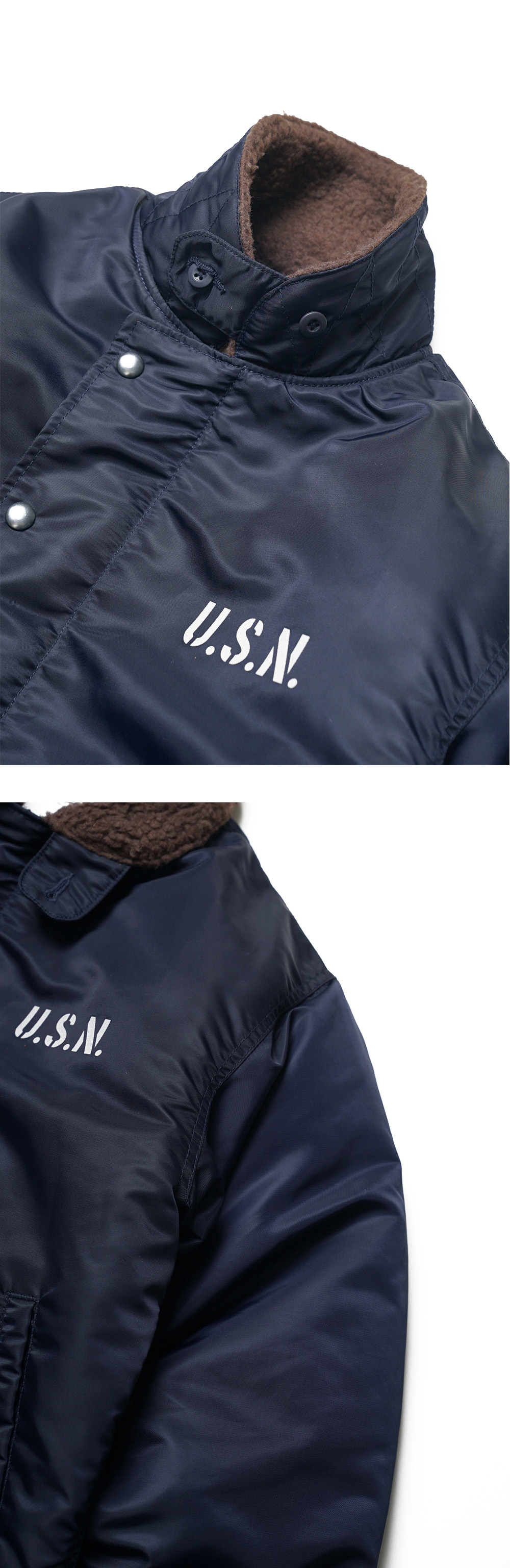 Houston Japan 51295 Nylon N-1 Deck Jacket - Navy 헤비한 나일론 트윌을 사용하여 제작한 N-1 자켓입니다. 충전재로는 리사이클 신슐레이트를 사용하여, 경량이면서도 높은 방한성이 특징입니다. 좌측 가슴에는 리플렉터 프린트로 디자인된 USN 스텐실 텍스트가 위치해있습니다. 착용시 'XL'가 일반적인 '103 사이즈', 'XXL'가 '108 사이즈' 정도입니다.