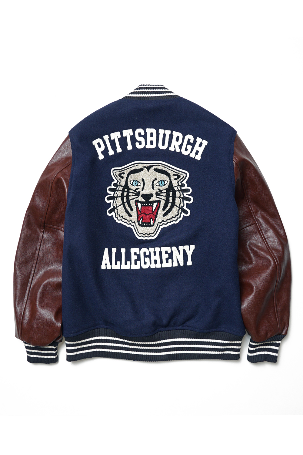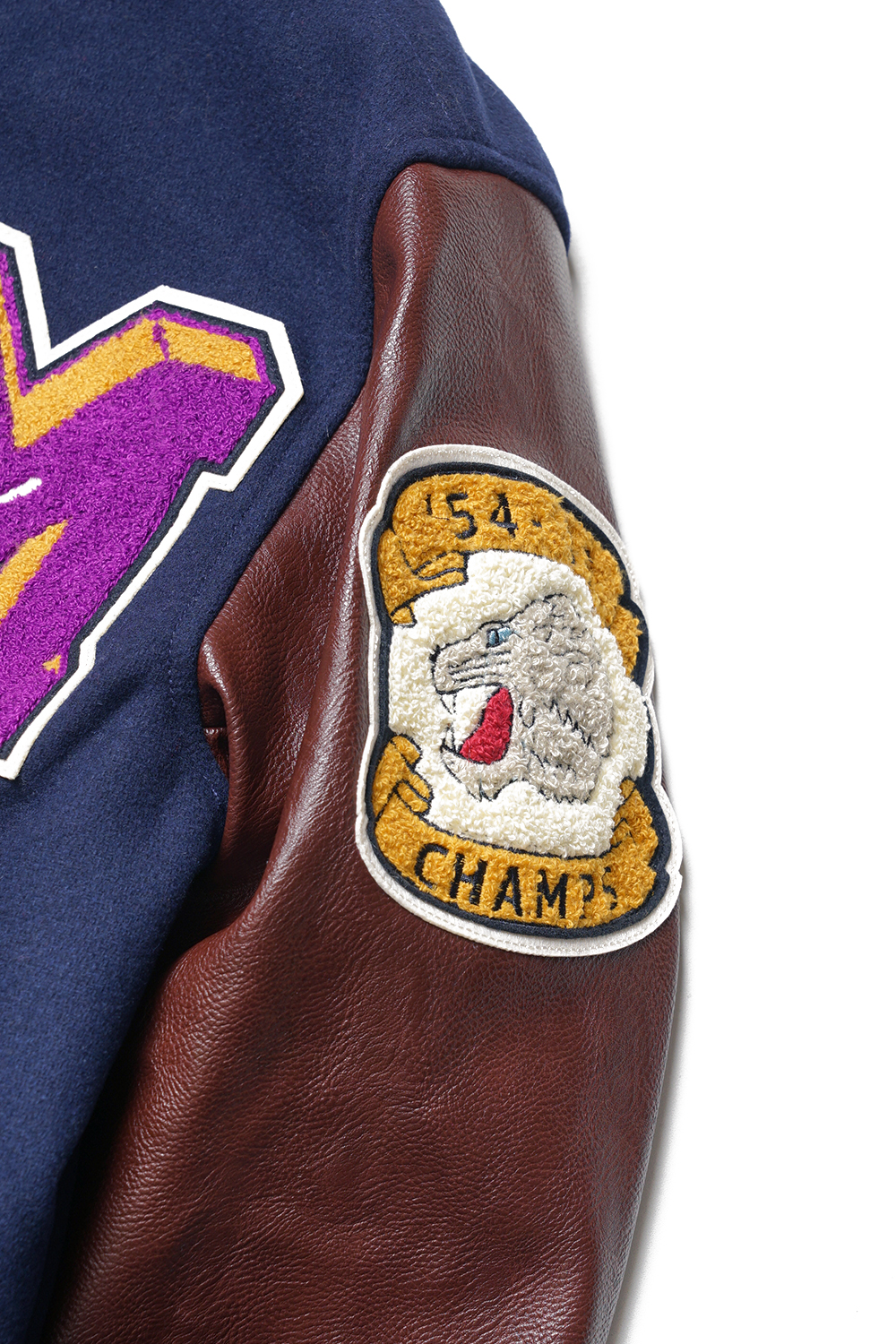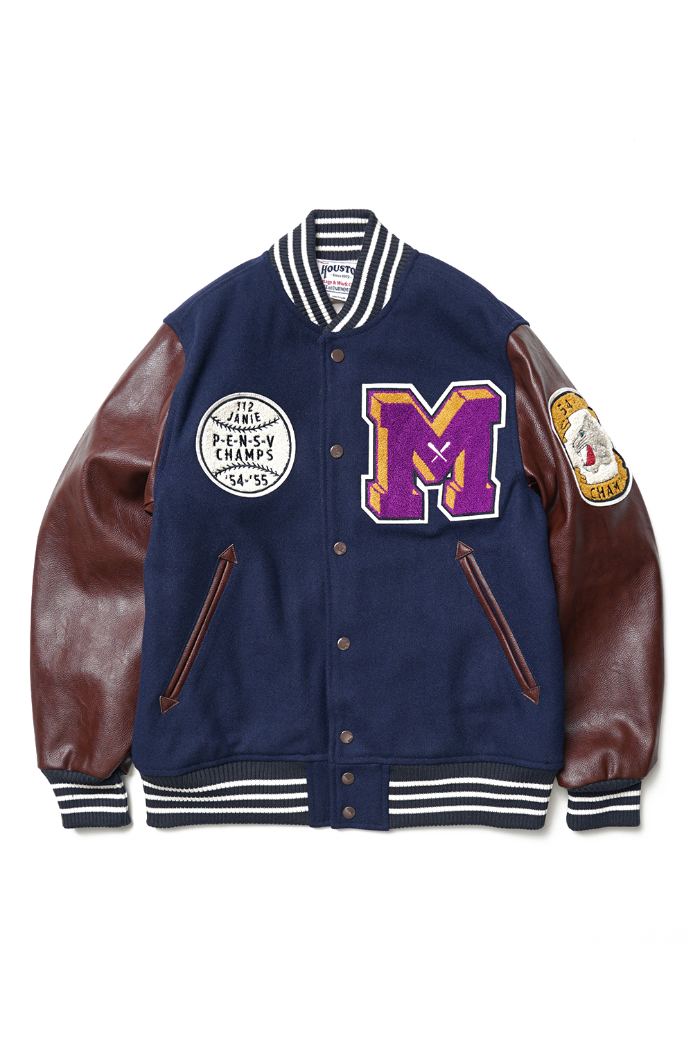 Houston Japan 51272 Melton Award Jacket (Cat) - Navy 두꺼운 헤비멜튼을 사용하여 제작된 스타디움 자켓입니다. 소매에는 합성피혁을 사용 하였으며, 프론트 양측으로 야구공과 알파벳 'M자'의 와펜이 특징입니다. 텍스트는 체인 자수로 마감하였으며, 신축성있는 넥카라는 3줄 배색 라인으로 디자인되었습니다. 왼쪽 소매와 후면부 역시 고양이 얼굴 와펜이 위치해 있습니다. 포켓은 코듀로이 원단을 사용하였으며, 안감에는 밝은 골드 색상의 퀼트 안감으로 제작하였습니다. 내부에는 왼쪽 가슴에 포켓과 브랜드 네임이 배치되어 있습니다. 착용시 'XL 사이즈'가 100-103, 'XXL 사이즈'가 '105-108' 정도입니다.