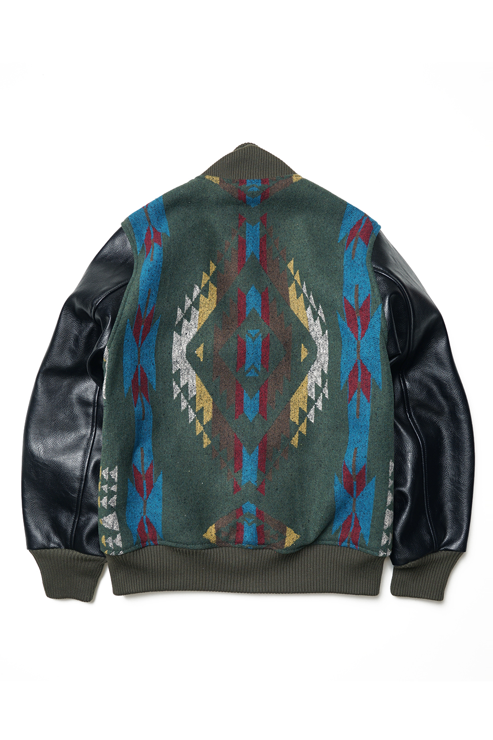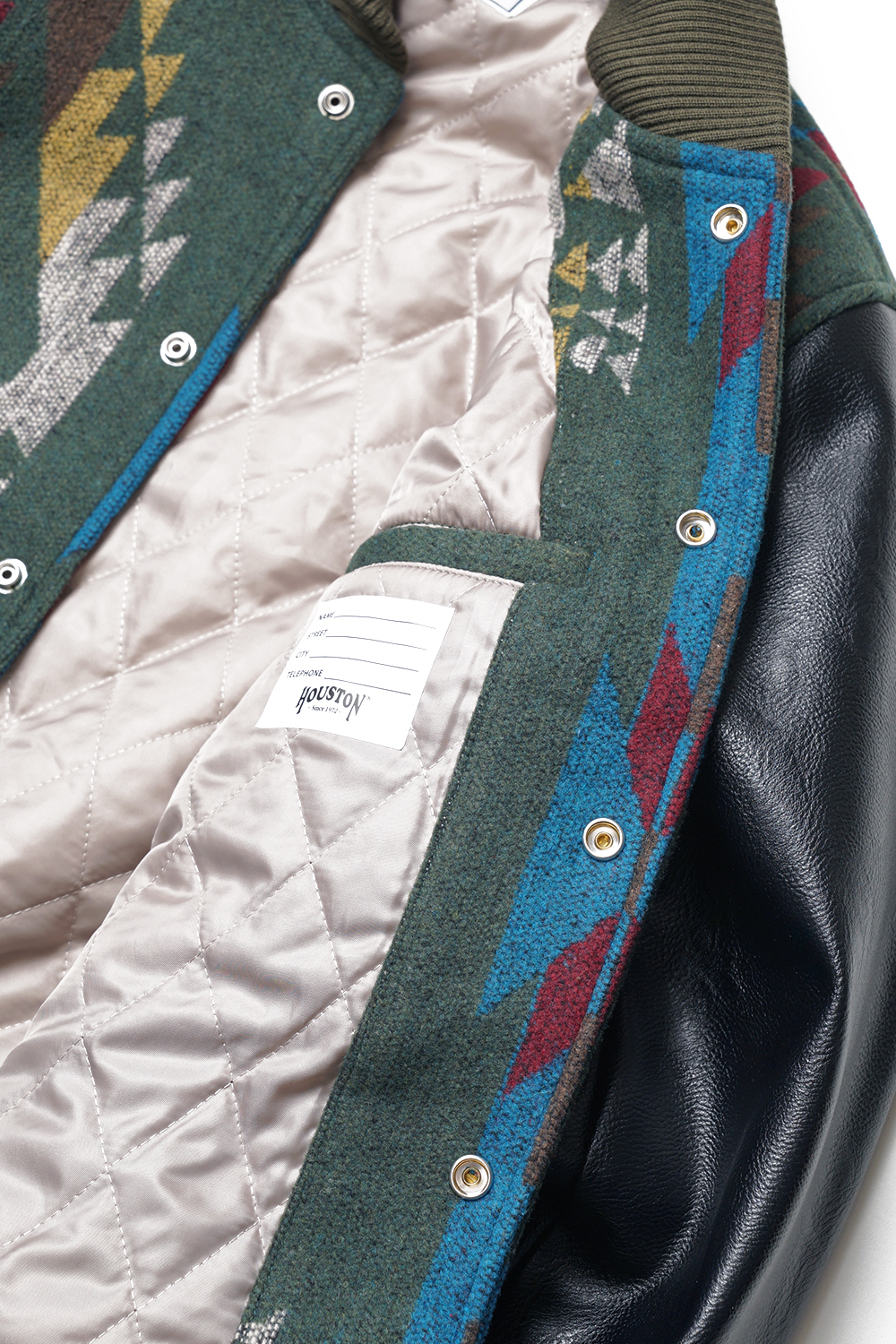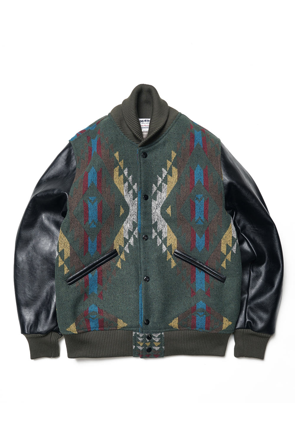 Houston Japan 51304 Melton Award Jacket (Native) - Olive Drab 네이티브 패턴의 멜튼을 사용하여 제작된 스타디움 자켓입니다. 소매에는 합성피혁을 사용 하였으며, 겉감은 본딩 가공으로 제작하여 탄성을 주었습니다. 포켓은 코듀로이 원단을 사용하였으며, 안감에는 밝은 골드 색상의 퀼트 안감으로 제작하였습니다. 착용시 'XL 사이즈'가 100-103, 'XXL 사이즈'가 '105-108' 정도입니다.