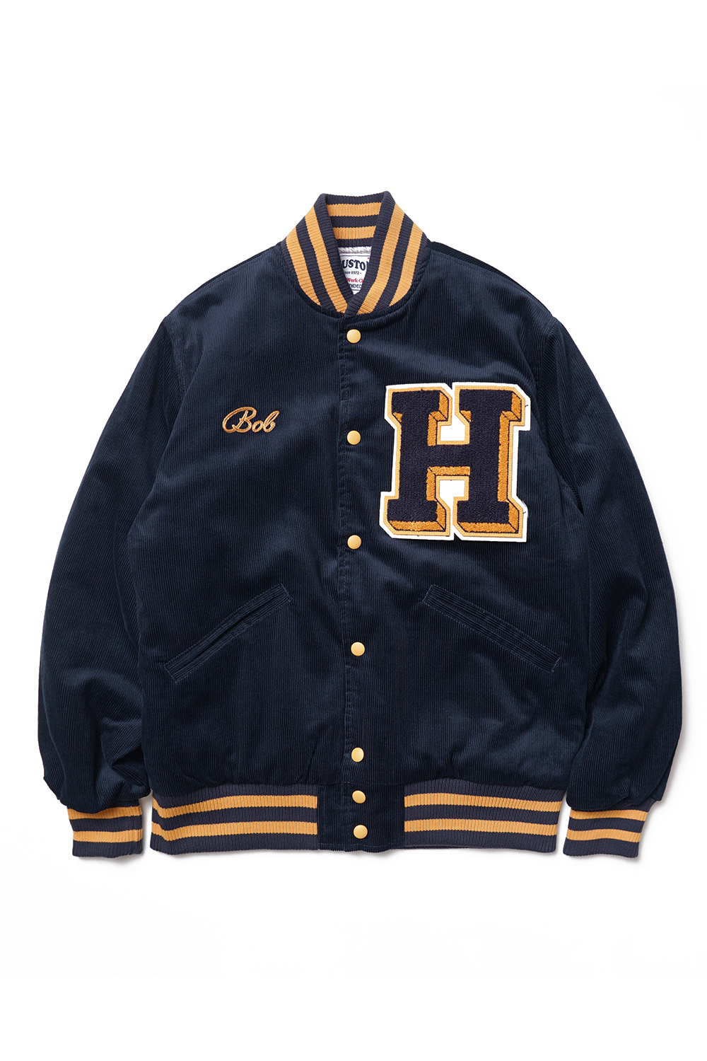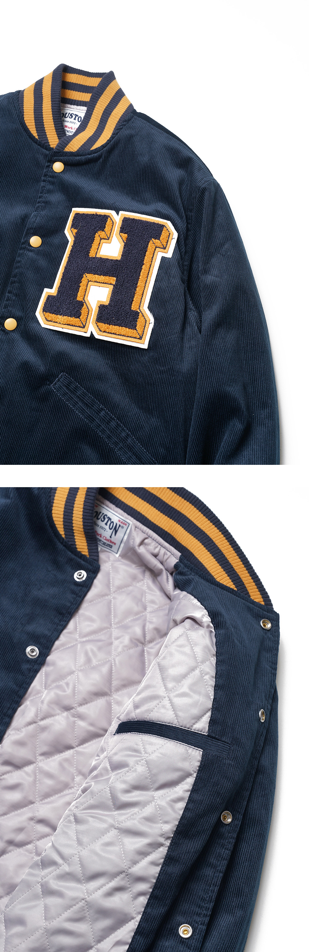 Houston Japan 51317 Corduroy Award Jacket - Navy 코듀로이로 제작된 스타디움 자켓입니다. 프론트의 왼쪽에는 큰 사이즈의 와펜이, 오른쪽에는 체인 자수가 있습니다. 착용시 'XL 사이즈'가 100-103, 'XXL 사이즈'가 '105-108' 정도입니다.
