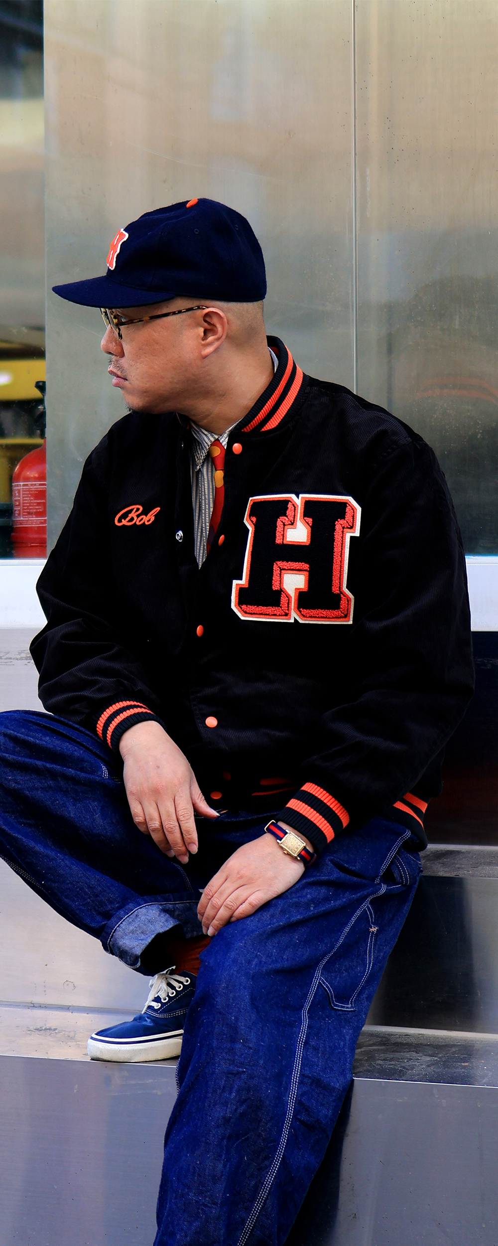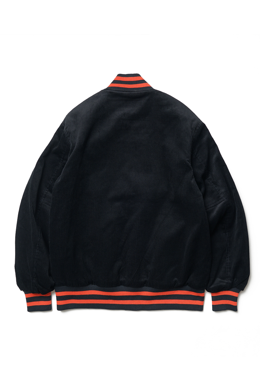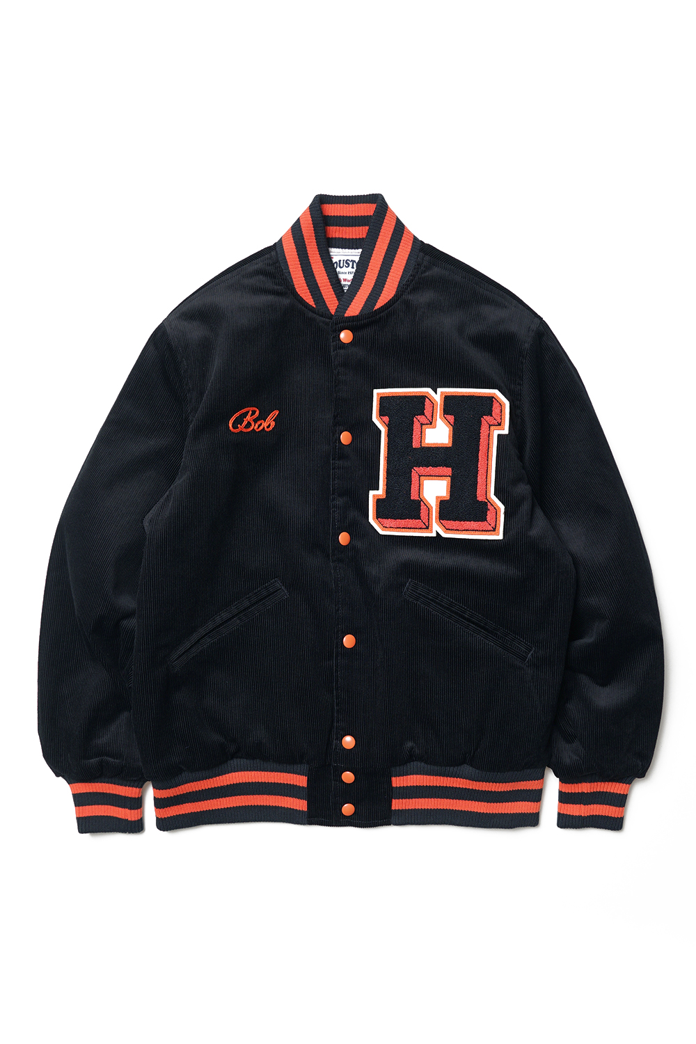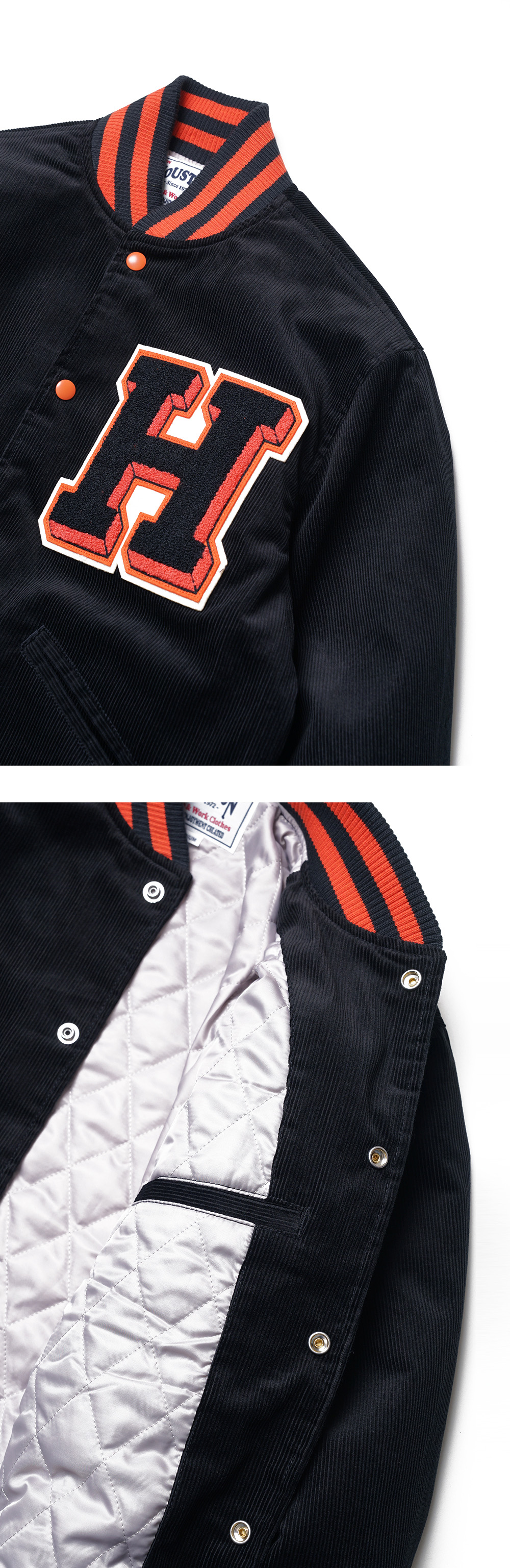 Houston Japan 51317 Corduroy Award Jacket - Black 코듀로이로 제작된 스타디움 자켓입니다. 프론트의 왼쪽에는 큰 사이즈의 와펜이, 오른쪽에는 체인 자수가 있습니다. 착용시 'XL 사이즈'가 100-103, 'XXL 사이즈'가 '105-108' 정도입니다.