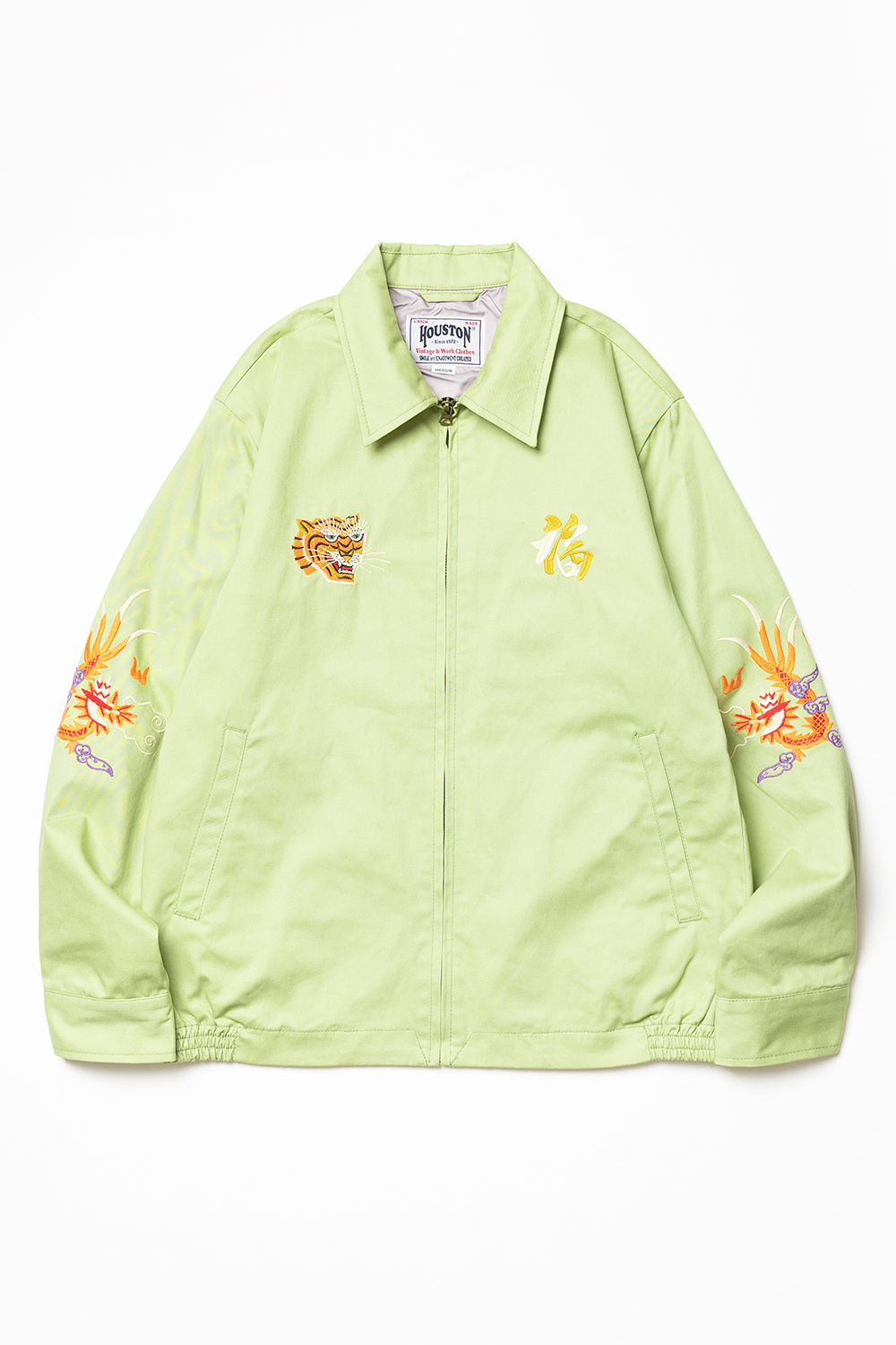 Houston Japan 51270 Cotton Vietnam Jacket (Skull) - Lime Green 화려한 컬러감의 코튼 능직을 사용하여 제작된 베트남 자켓입니다. 프론트는 집업 사양이며, 가슴의 양측으로 호랑이의 얼굴과 한자 복(福)이 자수되어 있습니다. 소매 역시 용의 자수가 디자인 되어 있으며, 싱글 버튼의 소맷단은 롤업에 용이합니다. 양측의 슬레쉬 포켓과 내부 좌측의 포켓이 있어 수납에 용이합니다. 후면부의 중앙에는 큰 형태의 해골 자수가 되어 있습니다.