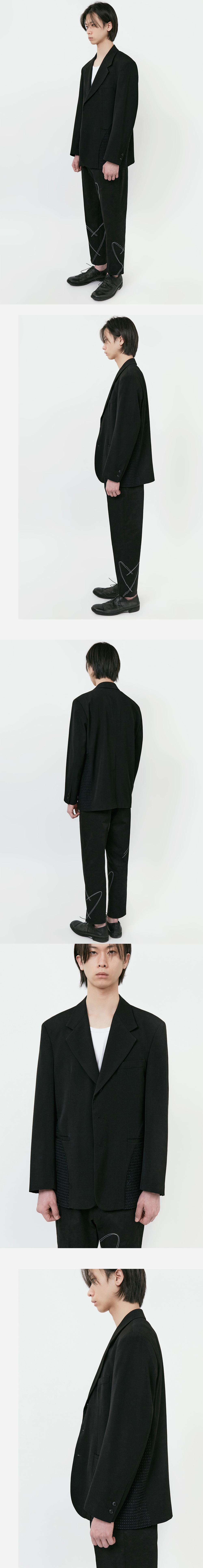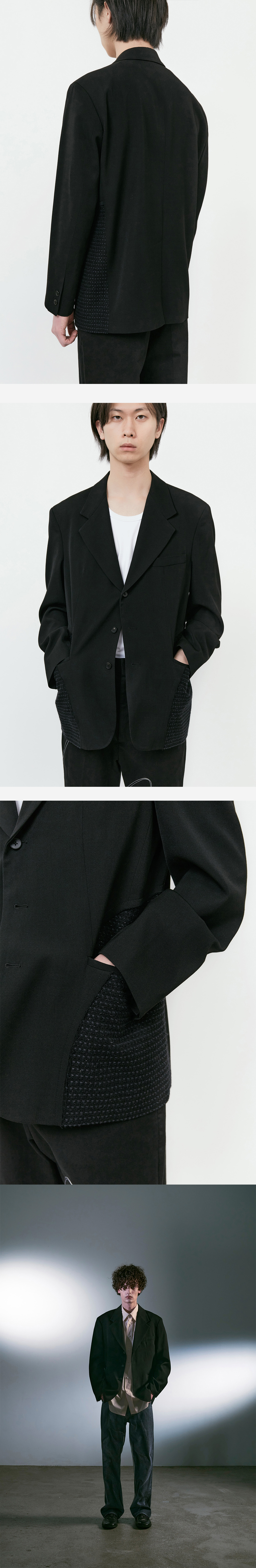 * 부드러운 울 소재와 고시감이 있는 상반되는 두 소재를 절묘하게 믹스 * 테일러드 기반 제작으로 어깨 패드, 덧심, 작심 등을 넣어 옷의 형태 안정성 높임 * 입체 패턴 곡선 소매 적용 * 높은 내구성과 복원력이 좋은 울 베이스의 소재를 사용하여 구김을 최대한 방지 * 통기성 우수한 울 소재 * 3버튼의 소뿔단추와 소매 2버튼 디테일 * 앞판 곡선 절개라인의 컷오프 디테일로 자연스러운 올 풀림 발생 * 안감으로 차가운 섬유인 비스코스 레이온 소재를 사용하여 따뜻한 봄 날씨에도 보다 착용이 용이함