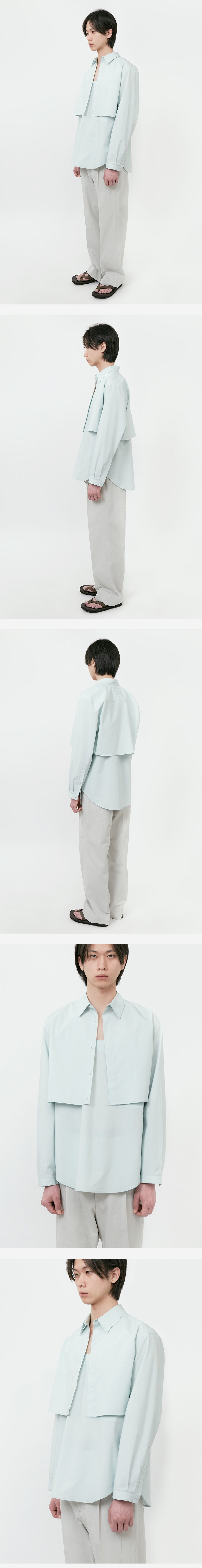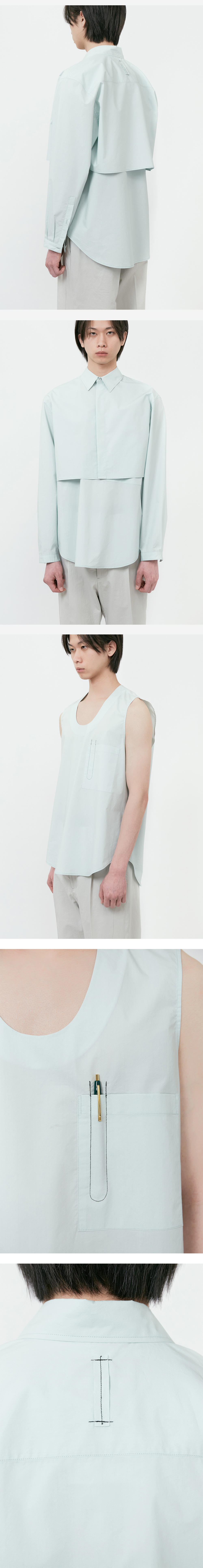 * 타이핑 미스테이크 21SS 투피스 셔츠의 버전업 모델 * 두개로 나눠지는 셔츠 디자인으로 개별로 다양한 스타일링 활용 * 상의도 가벼운 티셔츠와 함께 입을 수 있도록 설계되어 두 가지 제품으로 흥미로운 스타일링이 가능 * 슬리브리스는 재킷의 이너로도 그 활용도가 높음 * 60's high density cotton 100% 소재 사용 * 바이오 워싱 가공을 진행하여 최초 세탁시 수축이나 틀어짐 보완 * 봄,여름에도 착용이 용이한 두께감의 소재 * 이전 시즌에 선보였던 커팅 디테일을 최소화하여 단점 보완