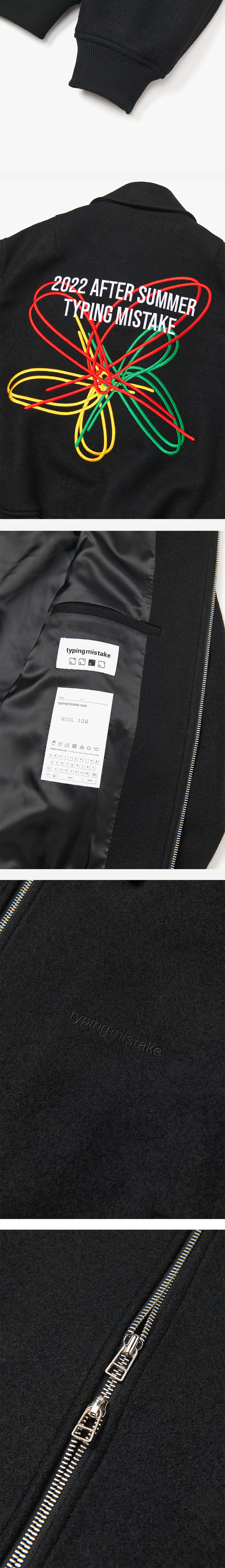 타이핑미스테이크의 22FW 시즌 그래픽이 높은 퀄리티의 자수로 표현된 부클 울 블루종입니다. 블랙과 레드 두가지 컬러의 부클울 소재를 활용하여 입체감 있는 패턴과 넉넉한 사이즈감이 특징이며, 타이핑 미스테이크의 볼륨감 있는 입체 패턴을 제품에서 느끼실 수 있는 제품입니다. 전면에는 소재와 같은 컬러로 타이핑 미스테이크의 메인 로고가 자수로 적용되어 있고, 후면은 재미있게 풀어낸 단어와 독창적으로 표현해낸 러브 그래픽이 가미된 제품입니다.