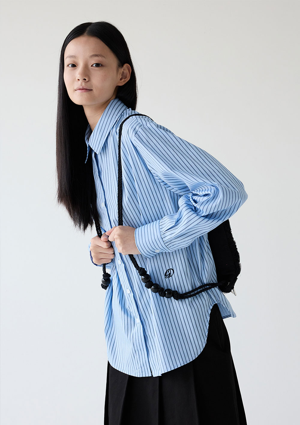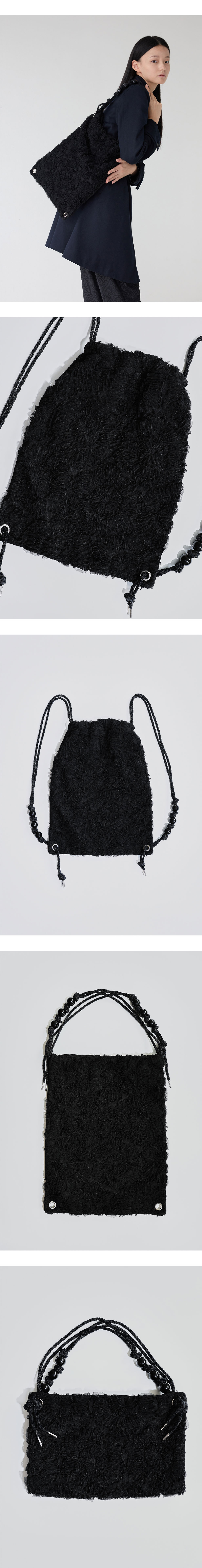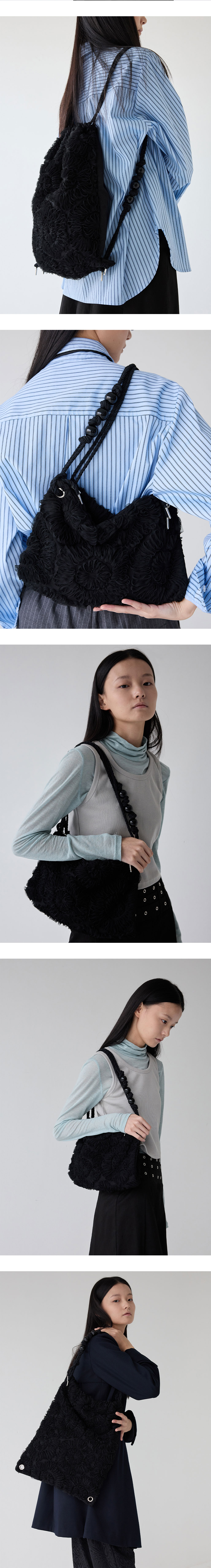 소녀와 어른 사이 찬란하게 흔들리는 우리 세대들에게서 영감을 얻었습니다. 불안하고 찬란한 청춘을 보내고 있는 우리에게 훗날 좋은 향수와 위로를 전달하고 싶습니다. 자수 모티브 작업으로 꽃을 표현해 고급스러운 텍스처 표현했습니다. 3개의 스트링을 엮어 마감후 고압 염색으로 마무리된 스트링을 사용했습니다. 가방끈의 무게 중심으로 고려하여 구슬을 엮는 디테일을 사용했습니다. 가방하단 아일렛을 이용해 3가지 스타일을 연출 할 수 있습니다.