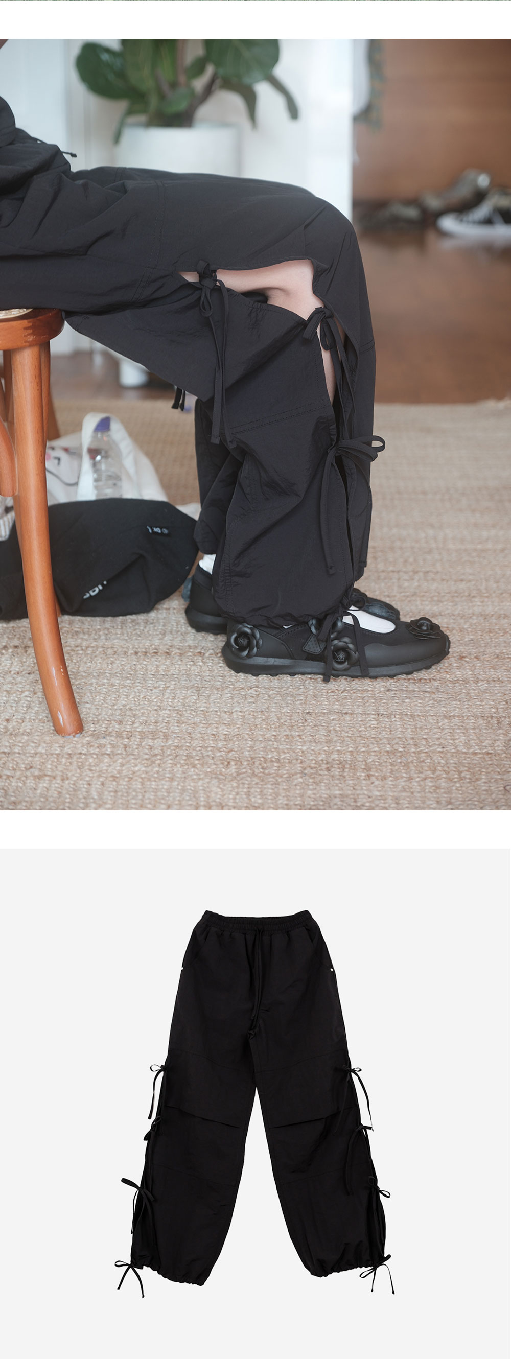 바지 전체적으로 총 16장의 파츠로 나누어 보다 고급스러운 디테일을 연출하였으며 옆라인에 트임 디테일로 시원하고 다양한 연출이 매력적인 디자인입니다. 트임을 따라 위치한 4개의 스트랩을 조정하여 원하는 실루엣을 연출할 수 있습니다. 스트랩의 정도에 따라 부츠컷,세미부츠컷,와이드핏,스트레이트핏 등 다양한 실루엣을 연출가능합니다. 포켓 끝단에서는 사랑스러운 하트 리벳으로 로맨틱한 분위기를 연출했습니다.