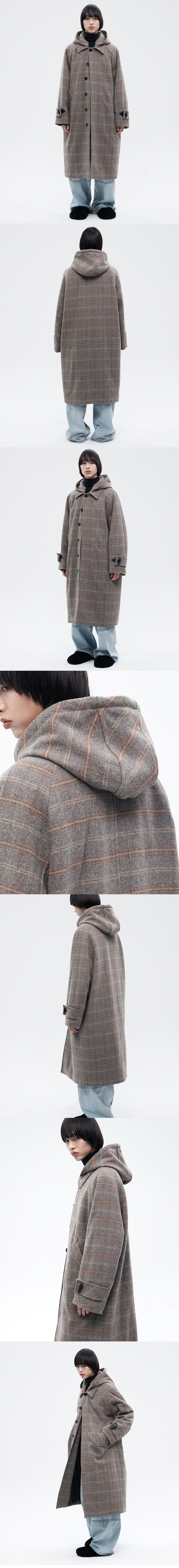 더플 코트와 맥코트 디테일을 믹스하여 유니크한 형태로 재해석한 후디드 맥코트입니다. 은은한 체크 울 소재로 제작되어 따뜻하고 편하게 입기 좋습니다. 3온즈 안감 패딩 처리로 한겨울 착용 가능하며 세미 오버핏 실루엣에 균형감이 좋아 데일리로 편하게 입기 좋습니다. -DETAIL- 1.개발한 삼각형 가죽 패치, 가죽끈 디테일로 완성된 소매 더플 코트 벨트디테일 2.후드 탈부착 가능 3.후드 사선 체크 디테일 4.안감 3온스 하스 패딩 처리로 한겨울 착용 가능 -model- mid long hair185/65 2사이즈 착용 mid hair183/63 2사이즈 착용