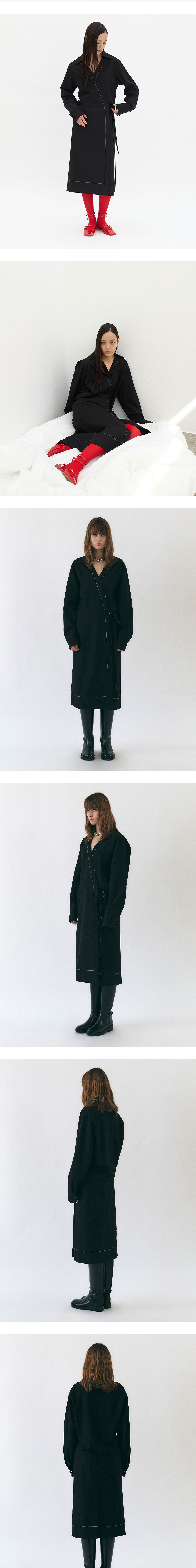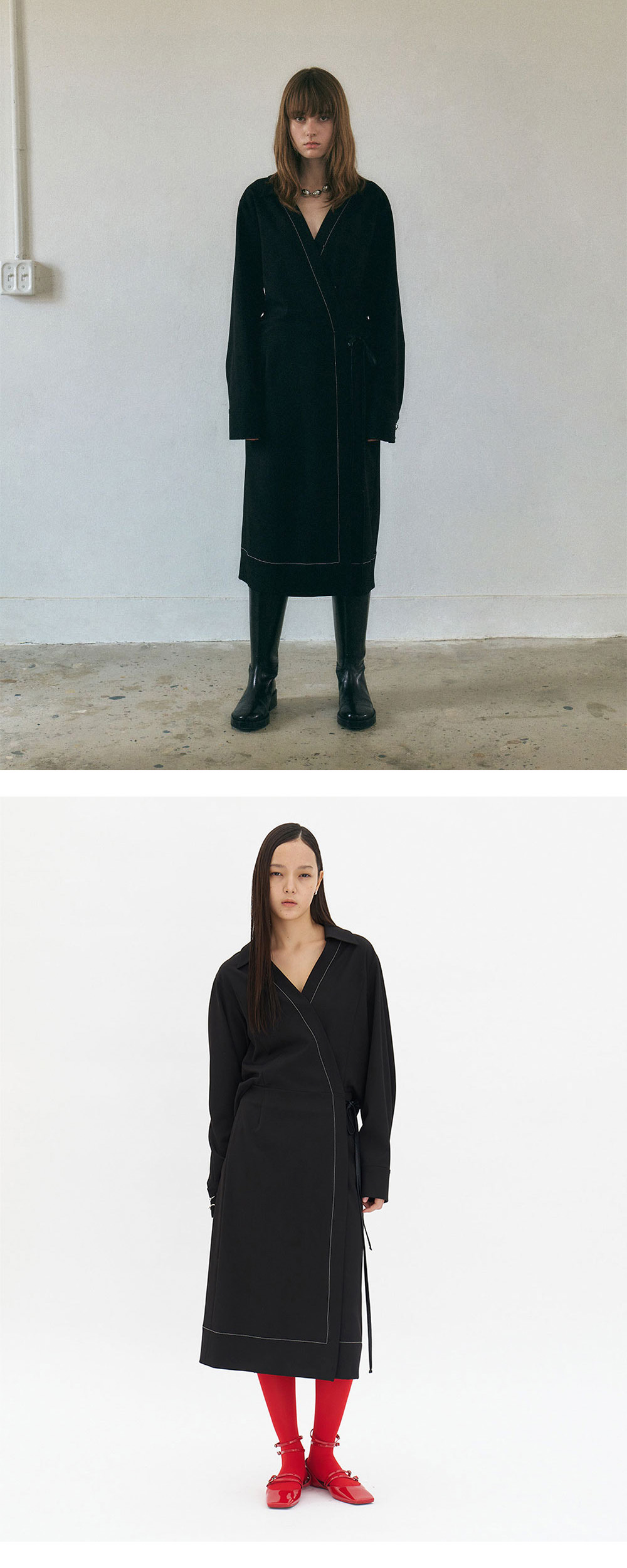 모던한 디자인이 돋보이는 랩 드레스로 속 단추로 사이즈 조절이 가능합니다. 셔츠와 스커트를 세트로 입은 스타일링을 의도한 디자인으로 다양한 스타일링이 가능합니다.