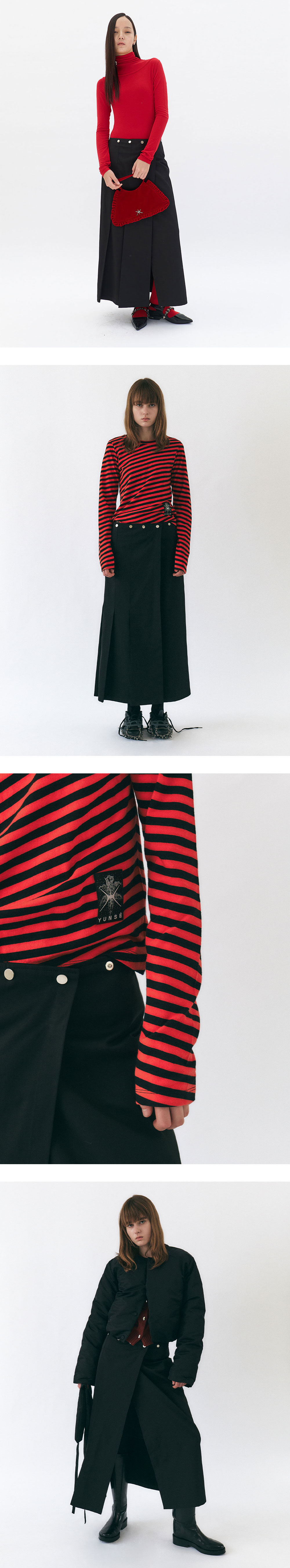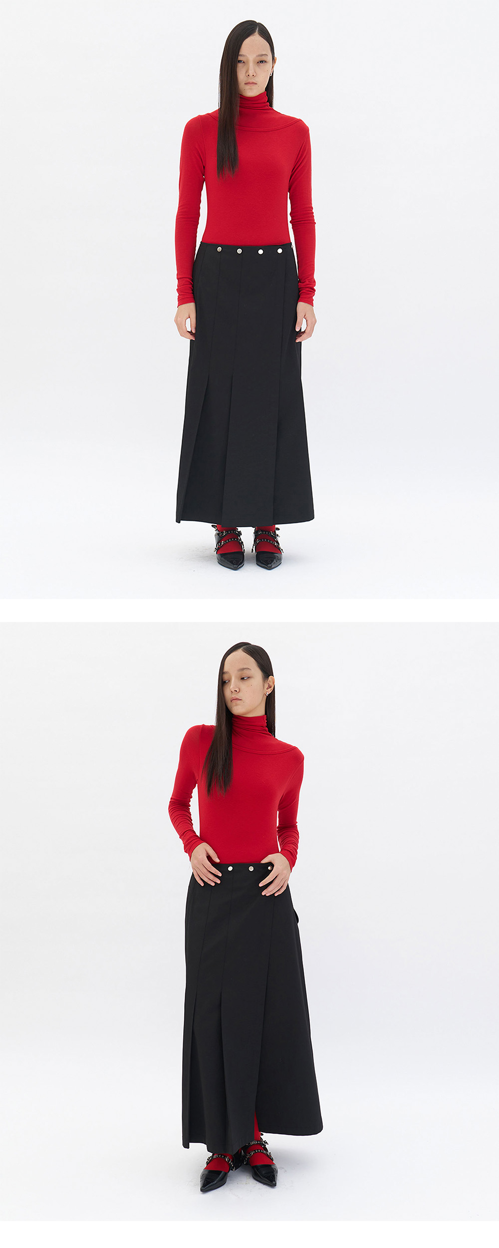 매 시즌 개발하고 있는 랩 스커트로 플리츠의 방향이 각기 다른 디자인이 포인트인 스커트입니다. 4개의 메탈 스냅을 사용하여 사이즈의 제한이 없으며, 로우웨이스트 또는 하이웨이스트로 다양한 스타일링이 가능한 제품입니다.