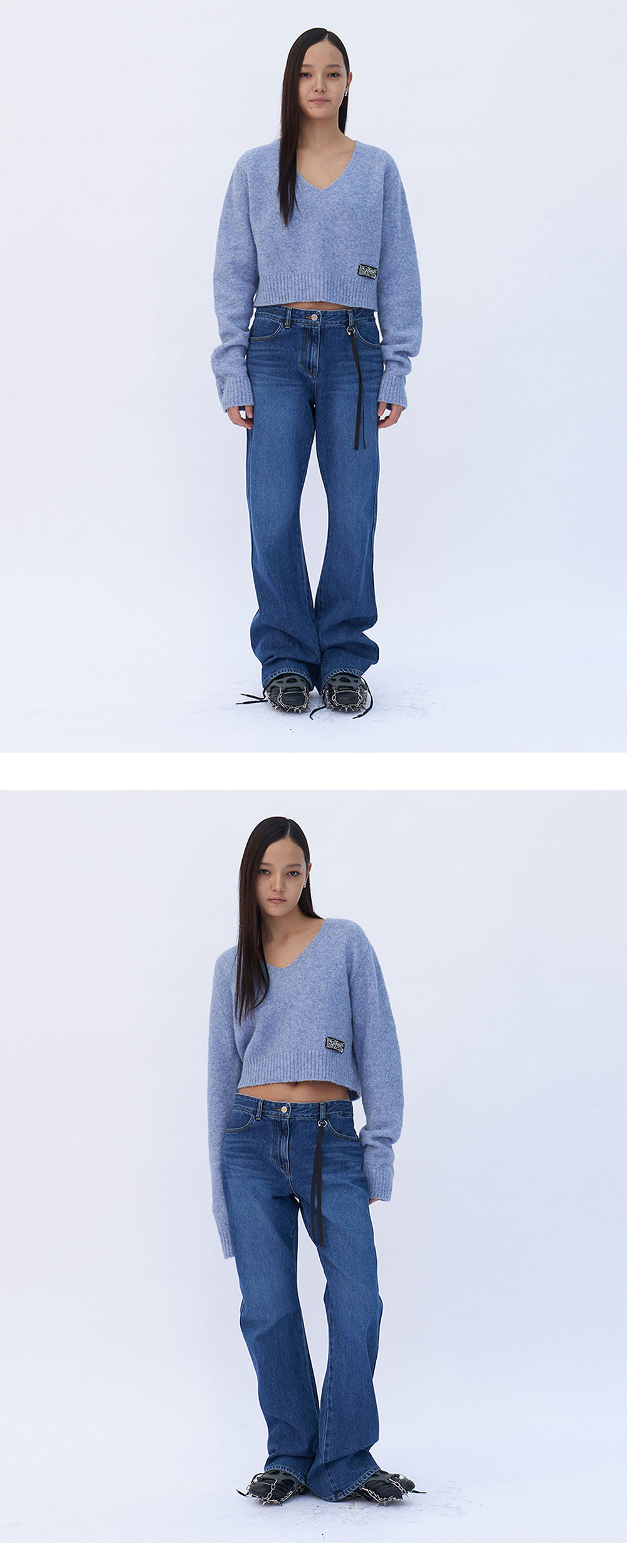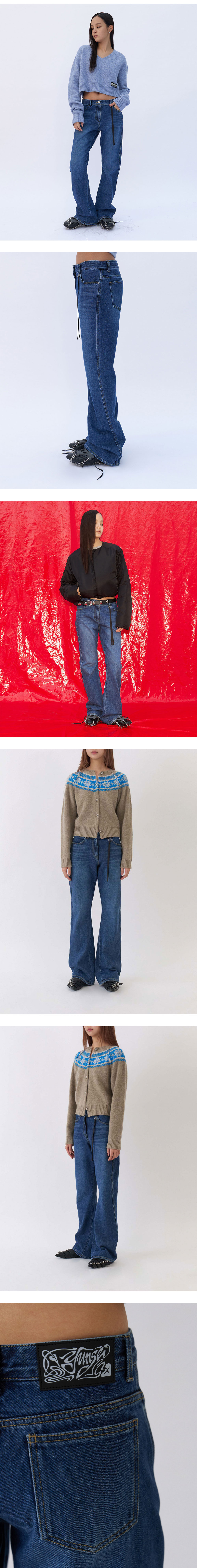 일반적인 스트레이트 핏이 아닌 커브드 패턴을 사용하여 입체 데님 팬츠로, 입었을 때 무릎에서 인심이 돌아 플레어 팬츠 효과를 냈습니다. 텍션지의 경우 화이트 잉크로 깨짐을 방지 하였으며, 윤세의 특징인 피어스드 링과 테이프로 매니쉬한 스타일링의 디테일을 추가했습니다. (세탁주의, 이염주의)