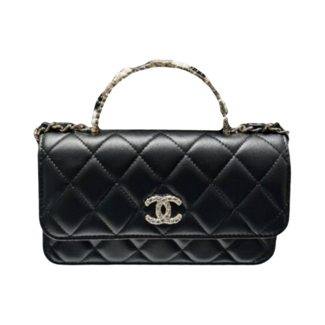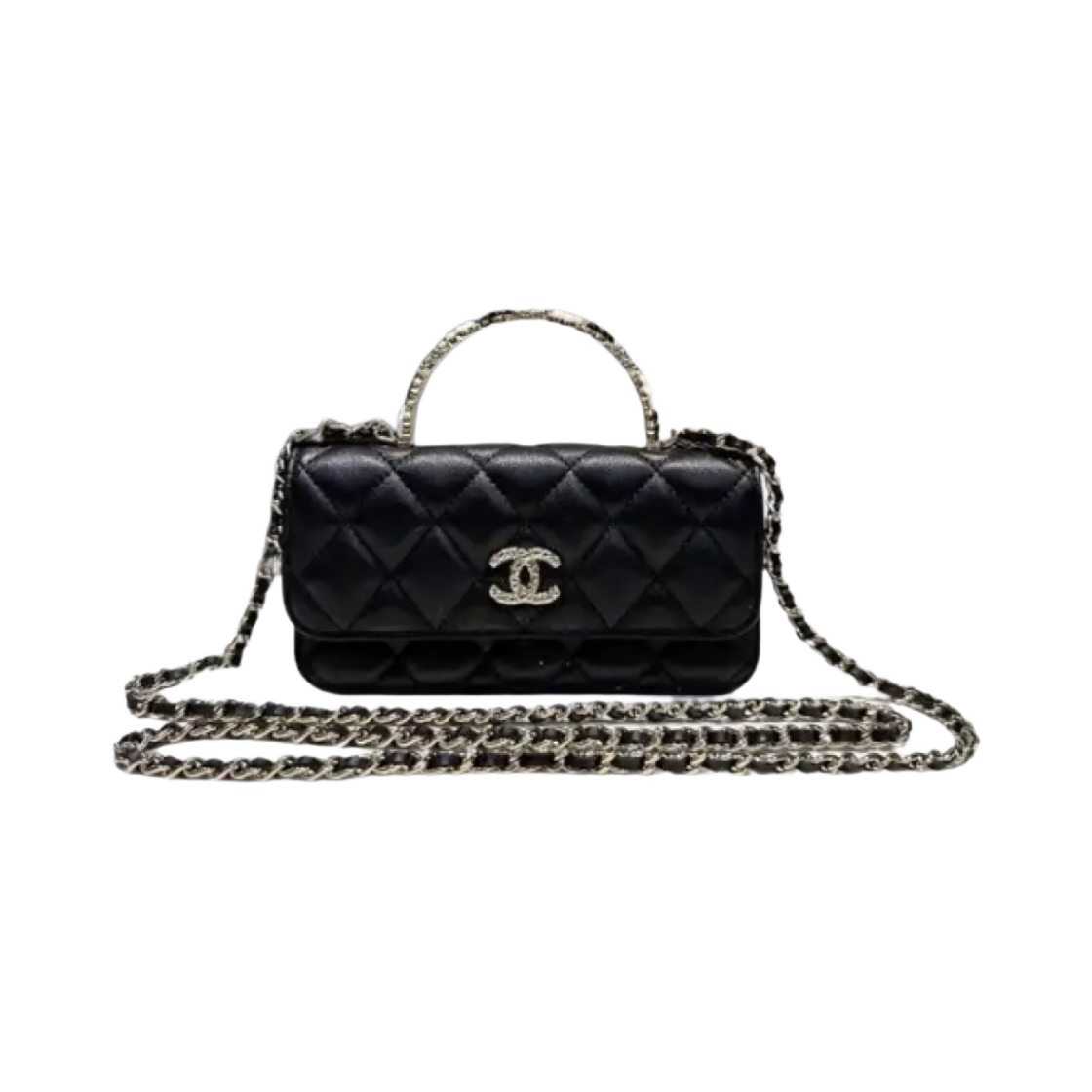 샤넬 체인 플랩 폰 홀더 램스킨 레진 & 골드 메탈 블랙