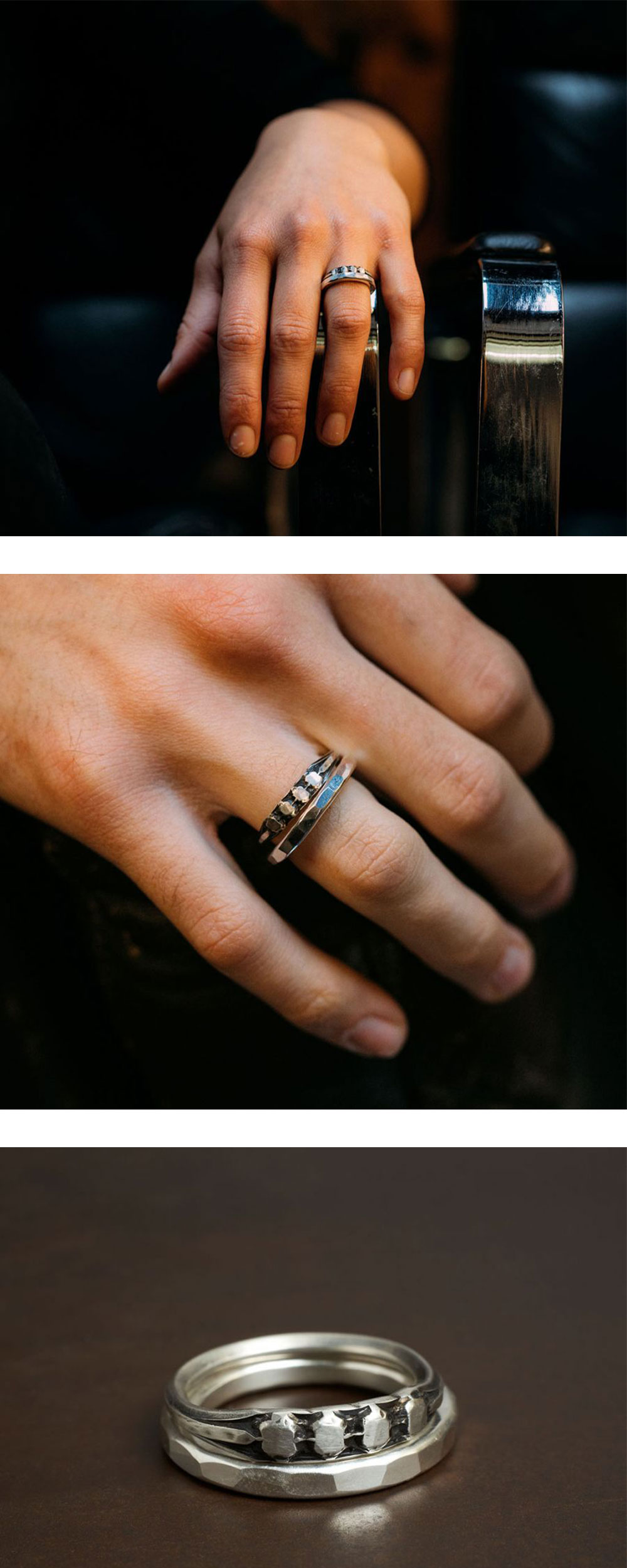 하단 링의 표면은 해머로 수작업되어, 피스마다 독특한 고유의 디자인을 보입니다. 이 링 조합에 Werkstatt:Munchen만의 해석을 담았습니다. "다이아몬드는 단단한 은이며, 결합한 링에 의해 빛이 반사됩니다."