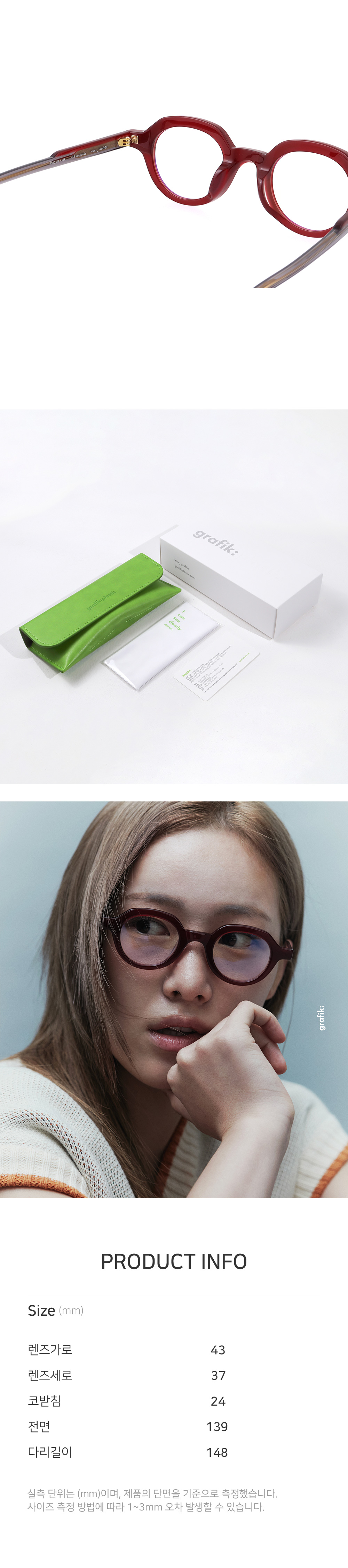 *안경테에 장착되어있는 렌즈는 프레임의 형태의 변형을 막기 위한 플라스틱 데모렌즈입니다.