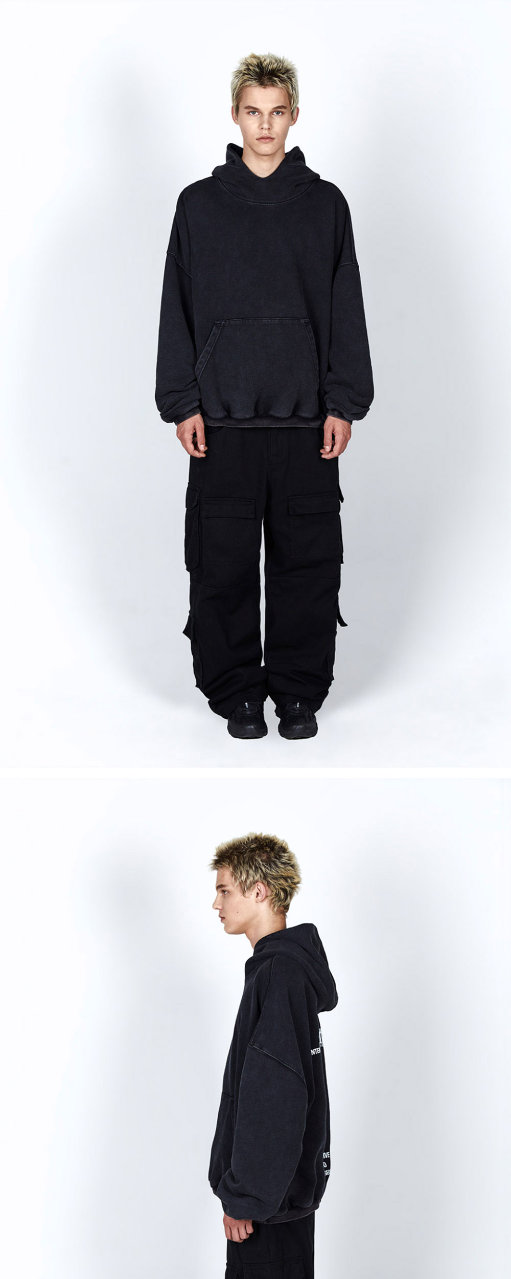- 밀로 아카이브의 오프라인 캠페인 프로젝트를 기념하여 새롭게 개발되어 발매한 캠페인 후디 - 오버한 아웃핏과 물 빠짐 워싱 공정을 거쳐 빈티지한 무드가 돋 보이는 후디 - 밀로 아카이브만의 브랜드 텍스트 그래픽을 겹친 형태로 뒷면에 보여줌 - 하단의 포인트 텍스트 나염과 함께 안정적인 레이아웃이 돋 보임 - 착용감에 포인트를 맞춰 여러 옷을 껴입어도 불편한 느낌 없이 착용 가능 - 둥근 쉐입의 넥 라인 디자인으로 보온성과 무거운 원단감이 아닌 부드럽고 가벼운 단단한 원단으로 제작되어 오랜 시간 착용이 가능함 야베: 182cm L SIze 착용 준수: 183cm L SIze 착용