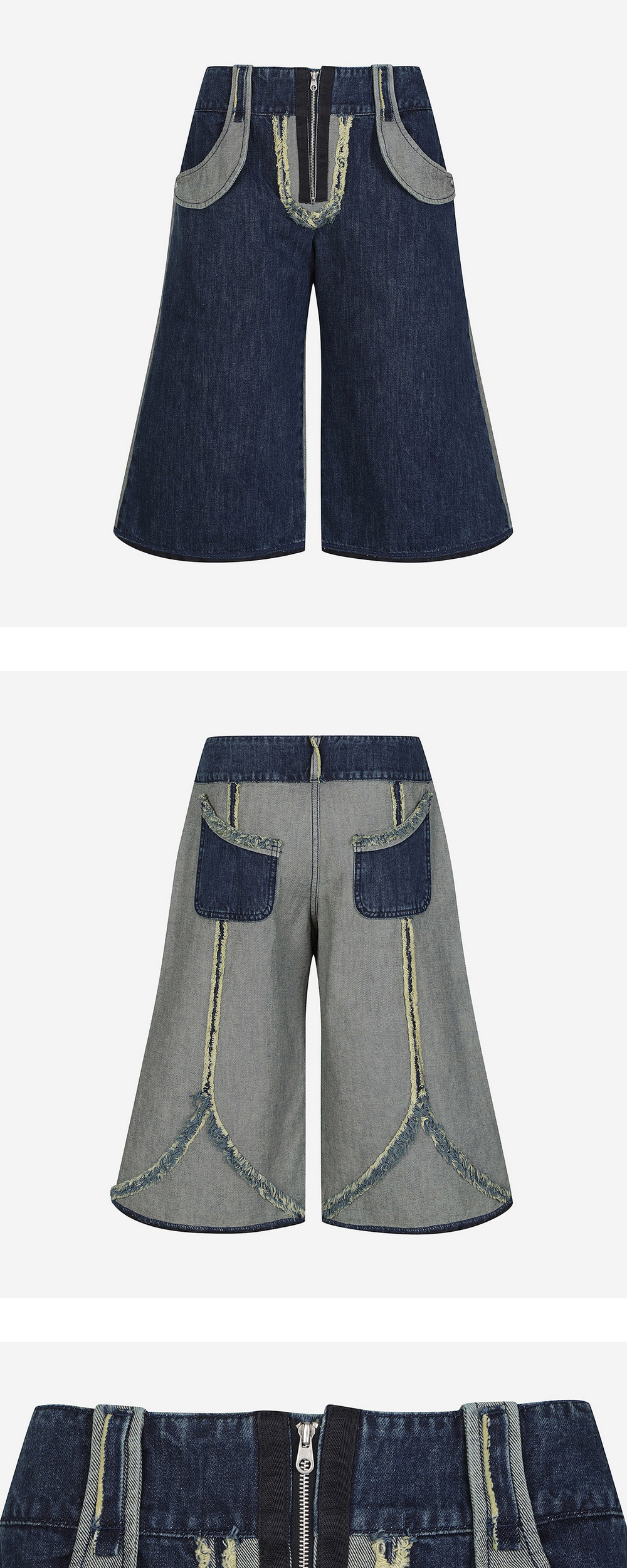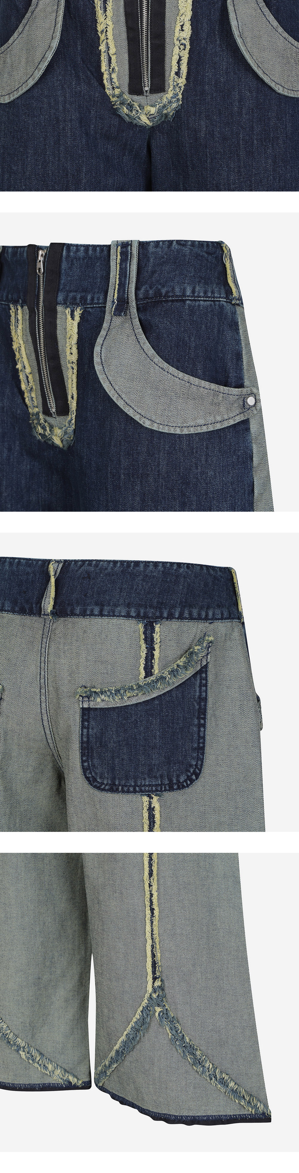 독특한 절개 라인과 전후면의 색반전이 특징인 데님 진입니다. 탄탄한 소재감과 실루엣, 그리고 헤진 듯한 디테일로 거칠면서도 우아한 분위기를 자아냅니다.