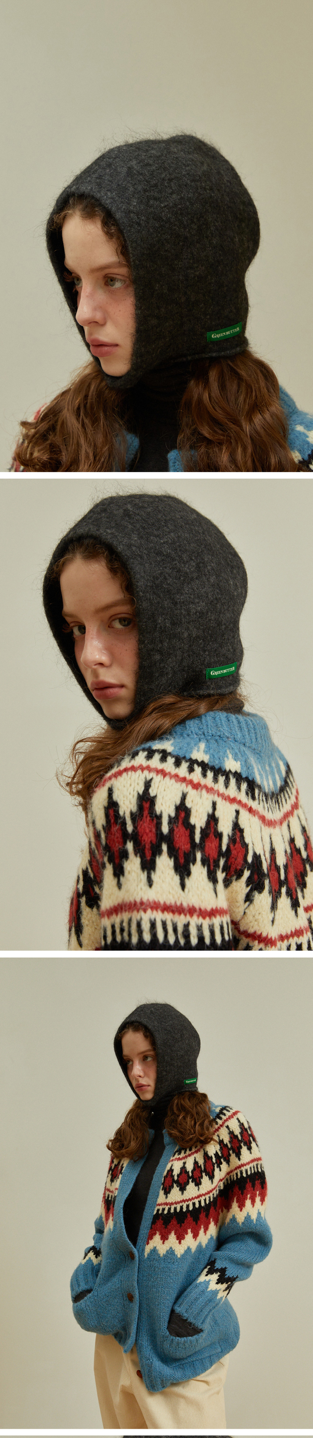 슈퍼키드모헤어33%, 울33% 함량으로 보풀과, 뭉침현상을 최소화했고 구김이 잘 가지 않으며 포근하면서 가볍고, 보온성이 뛰어난 바라클라바입니다.슈퍼키드모헤어 특유의 기장감이 느껴지는 기모효과와 컬감이 특징으로 베이직한 디자인에 그린색라벨을 포인트로 부착했습니다.스판함유로 피팅시 편안하고 텐션을 유지해주며 턱 끝을 완전히 감싸는 실루엣으로 광대를 가려주며 얼굴을 감싸안아얼굴이 작아보이는 핏으로 완성한 바라클라바입니다.