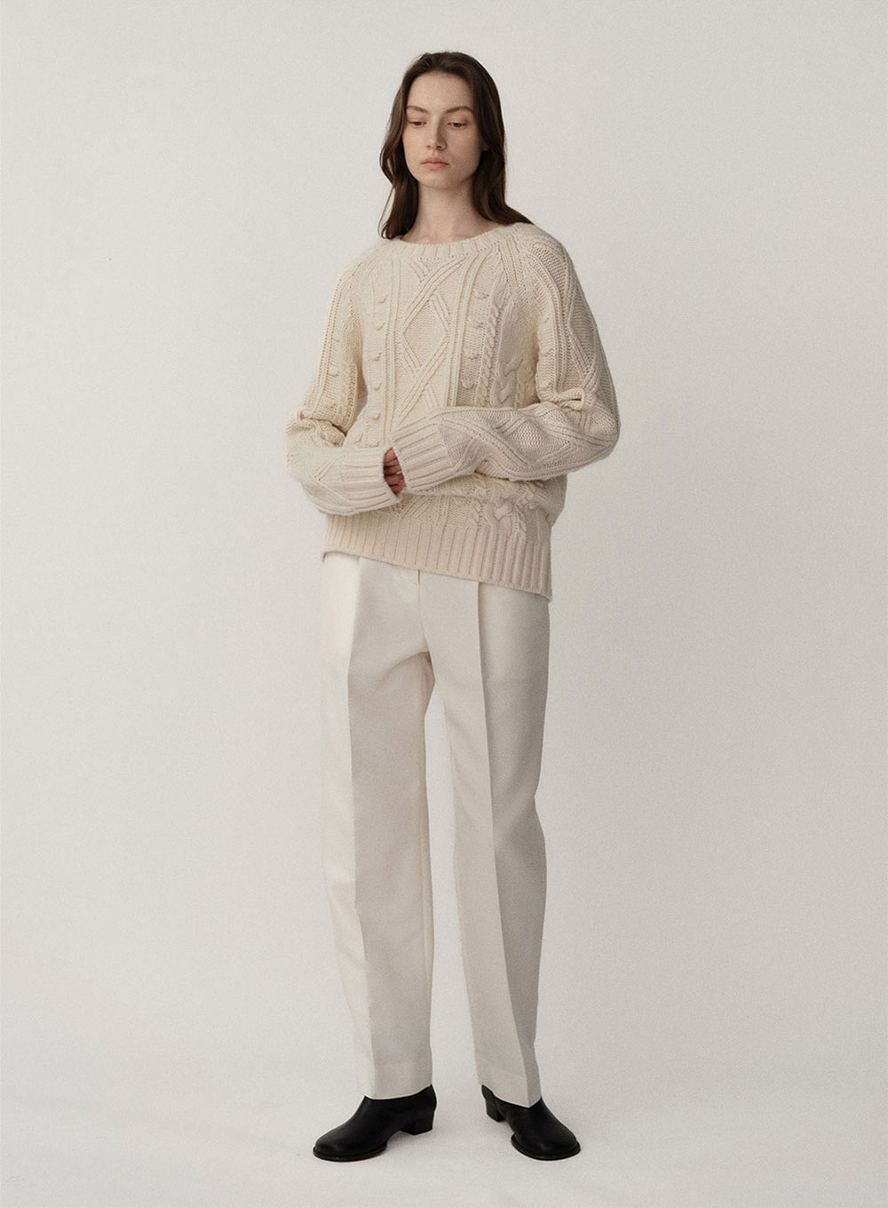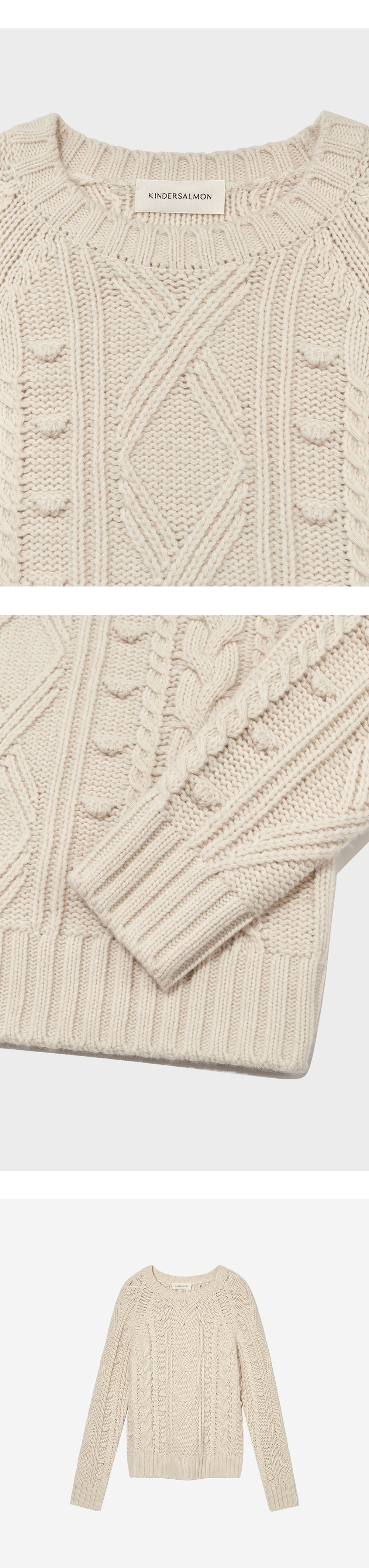 케이블조직과 방울디테일이 돋보이는 피셔맨 니트입니다. 동그랗게 떨어지는 라운드 소매, 원사를 사용하여 입체적으로 제작된 방울 디테일로 러블리함을 극대화하였습니다. 높은 울 함유율의 원사를 사용한 도톰한 두께감으로 추운 계절에 아우터 안에 무리없이 단독으로 착용하기에도 좋습니다.