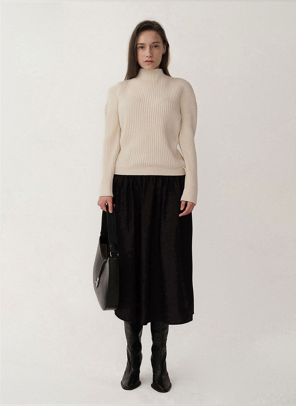 살짝 러플지게 올라오는 터틀넥으로 페미닌하게 표현한 터틀넥 니트탑입니다. 드롭숄더를 통해 자연스럽게 잡히는 봉긋한 숄더라인을 의도하였으며, 2*2 리브조직으로 짜인 촘촘한 조직감으로 완성도 높게 제작되었습니다. 다양한 스타일에 매치하기 좋은 스페어 아이템입니다.
